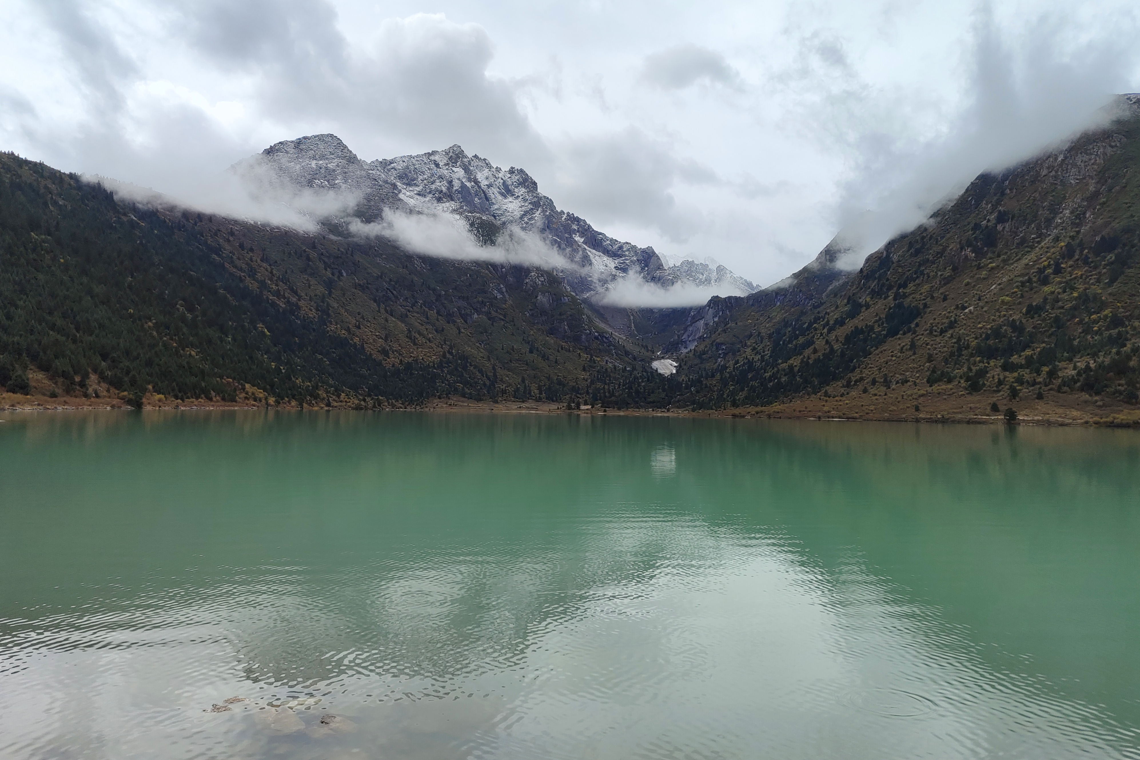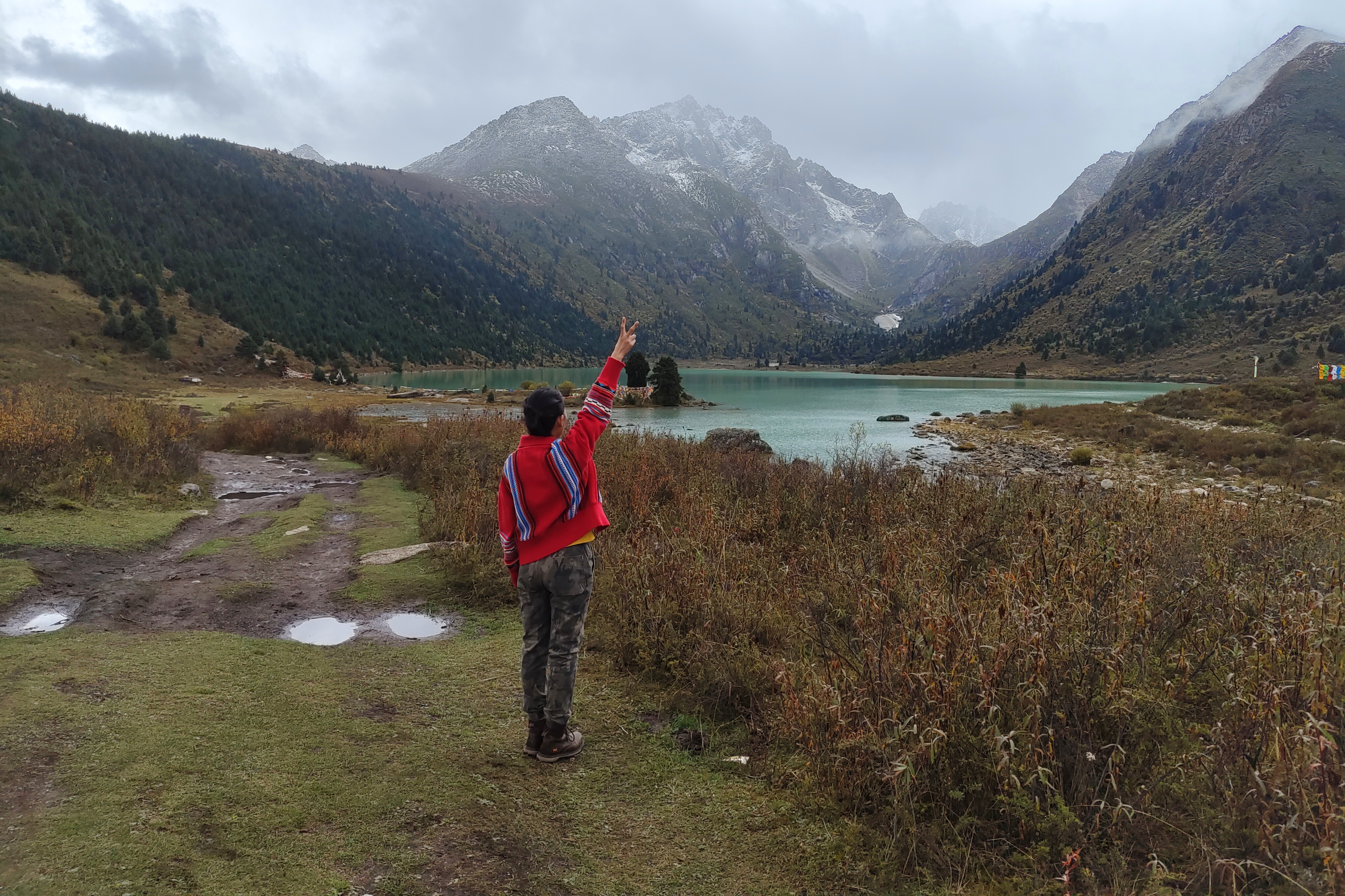 其实今天天气并不算太好,待我们抵达挡子措时,雀儿山并未露面,而是害羞地藏在了云中。我们也只得在湖边留影。