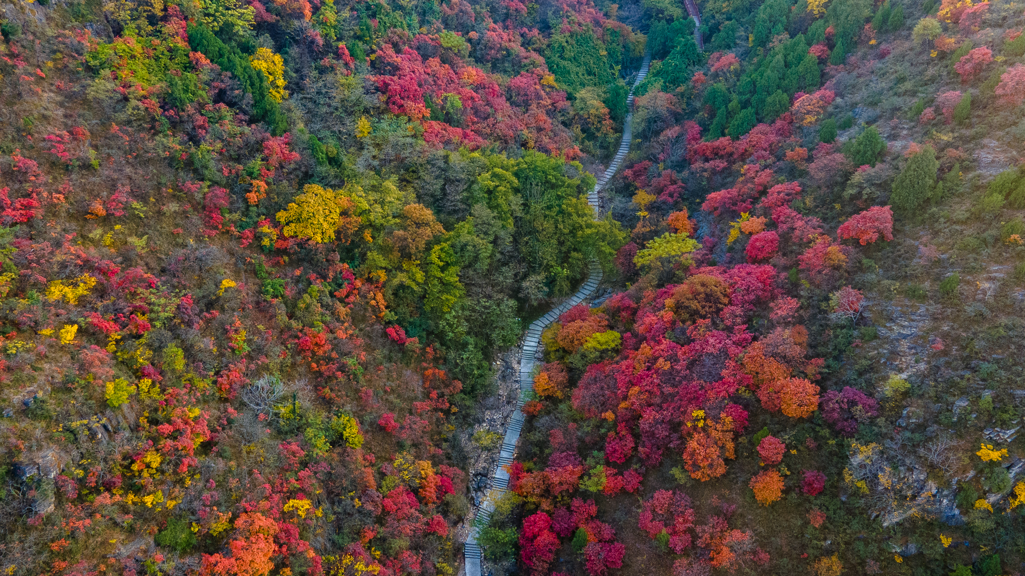 秋天的皇藏峪是一幅五彩斑斓的画卷,山间树木红黄绿相间,落叶飘舞,仿佛置身于油画之中。这里有千年的黄杨、银杏、青檀等古树,为景区增添了古朴神秘的气息。