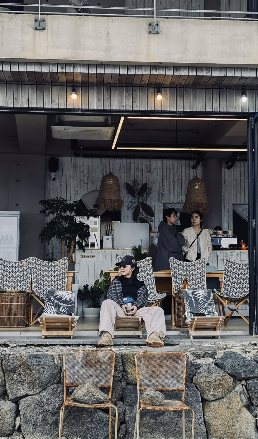 我们适度欣赏和拍照留恋之后,就去找便利店了,刚好看到岸边那一排商品有个CS便利店,旁边还有一个西式快餐店,小伙子选择吃汉堡可乐,我和小马则进了便利店找中式预制菜。因为小伙子点餐时候选择的打包,所以快餐店店员把他赶出来了,我和小马买好盒饭加热之后,本来还想去快餐店跟小伙子一起享用午餐,正好碰到小伙子被赶出来,就一起出门向海边一个小亭子走去,刚好那里人不多,我们仨在一条长凳上各自享用着自己来济州岛的第一餐。边吃边聊天,吹着海风,面朝大海,小马还点了啤酒,我买的是牛奶,小伙子喝的是可乐,我们都在有限的条件下选择了我们最喜欢的饮料和餐食,这甚至比看似免费的团餐美味。