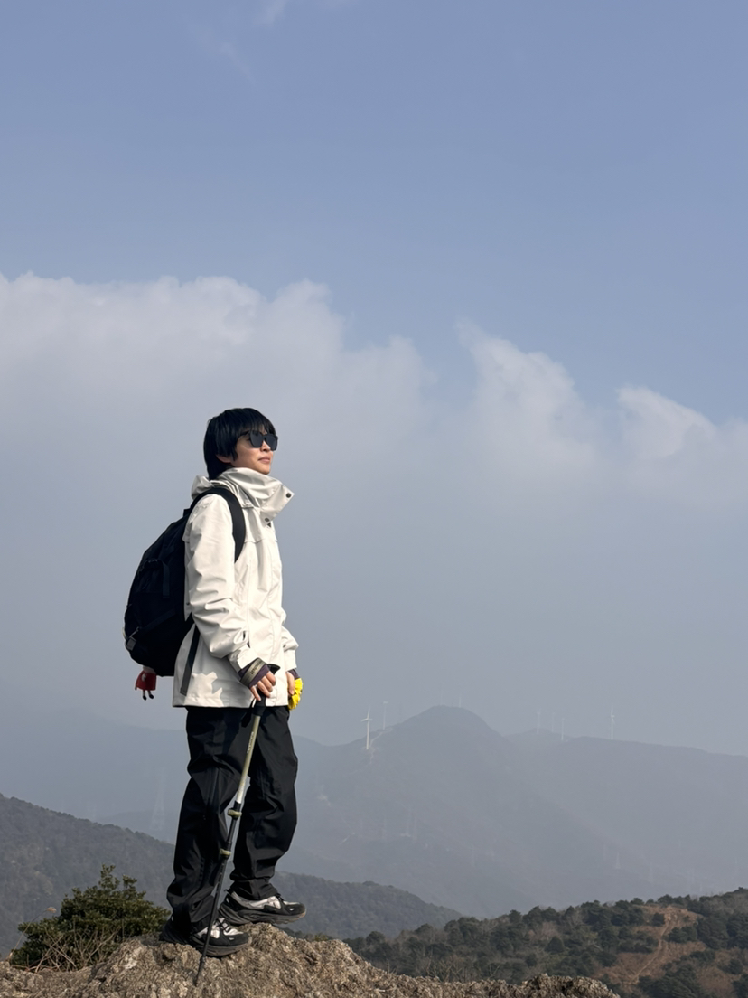 呼。到达山顶⛰️了,当然要美美的拍照,还是我上次拍照的机位,这个位置就拍吧,真的好看,如果背景的天空再蓝一些就更好看了拍了好多,挑出两张帅气的小姐姐,酷酷的🕶️