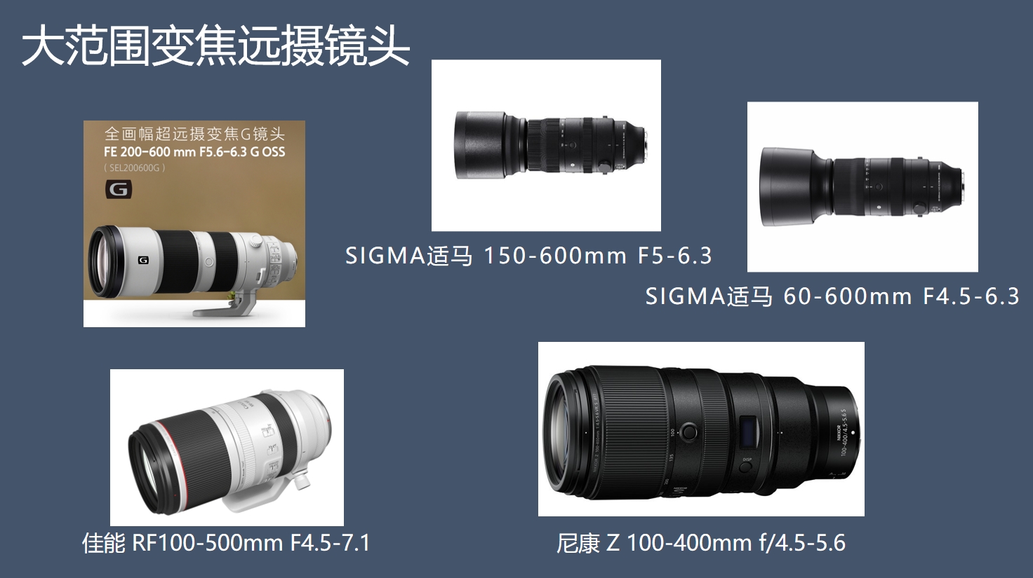 长焦镜头,主要是远距离拍摄南极冰川、野生动物等,推荐远距离的大范围变焦镜头,如150-600mm、100-500mm等镜头。