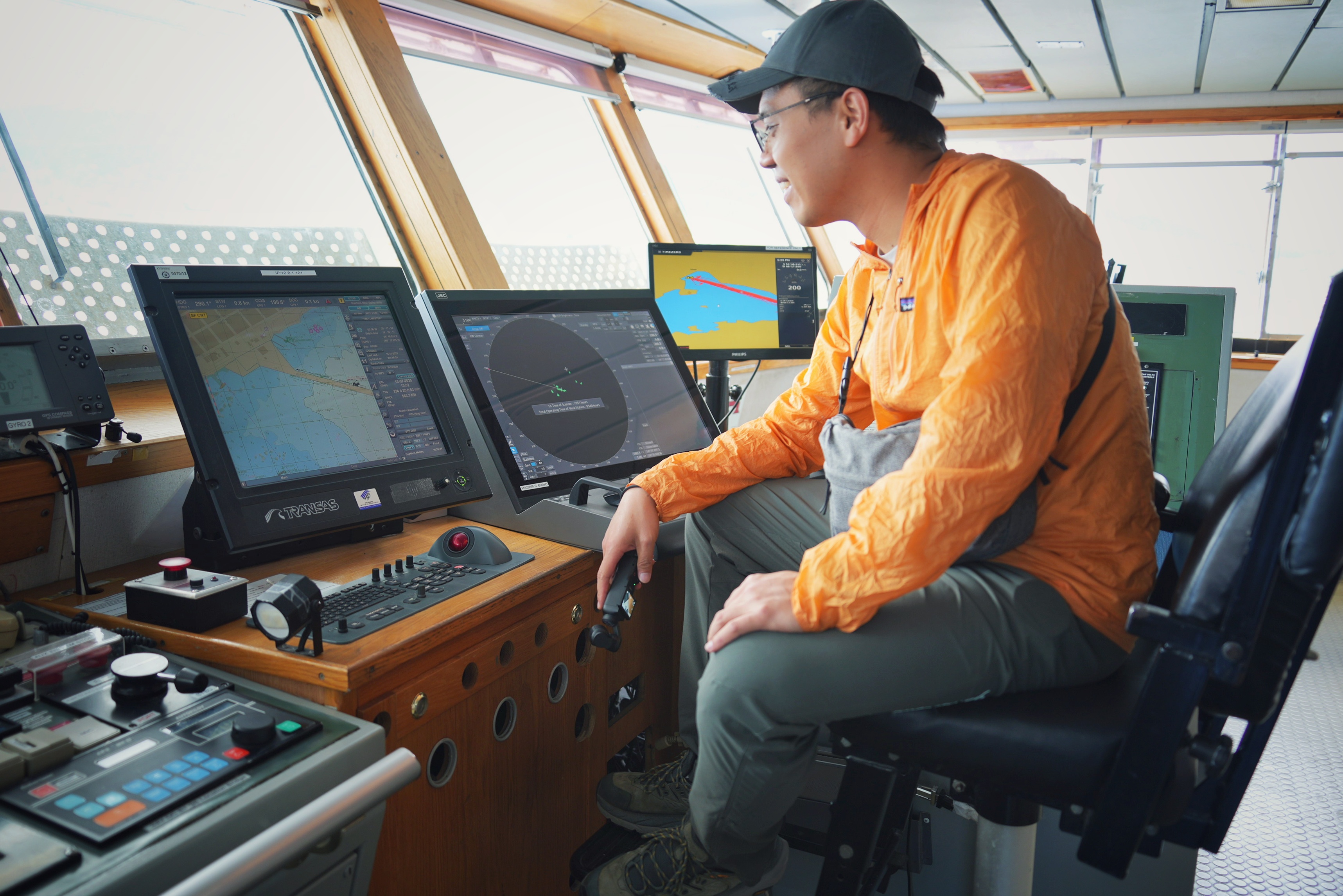 穿越“勒莫尔水道”期间,海面上有许多浮冰,船长亲自掌舵,小心翼翼的行驶着。