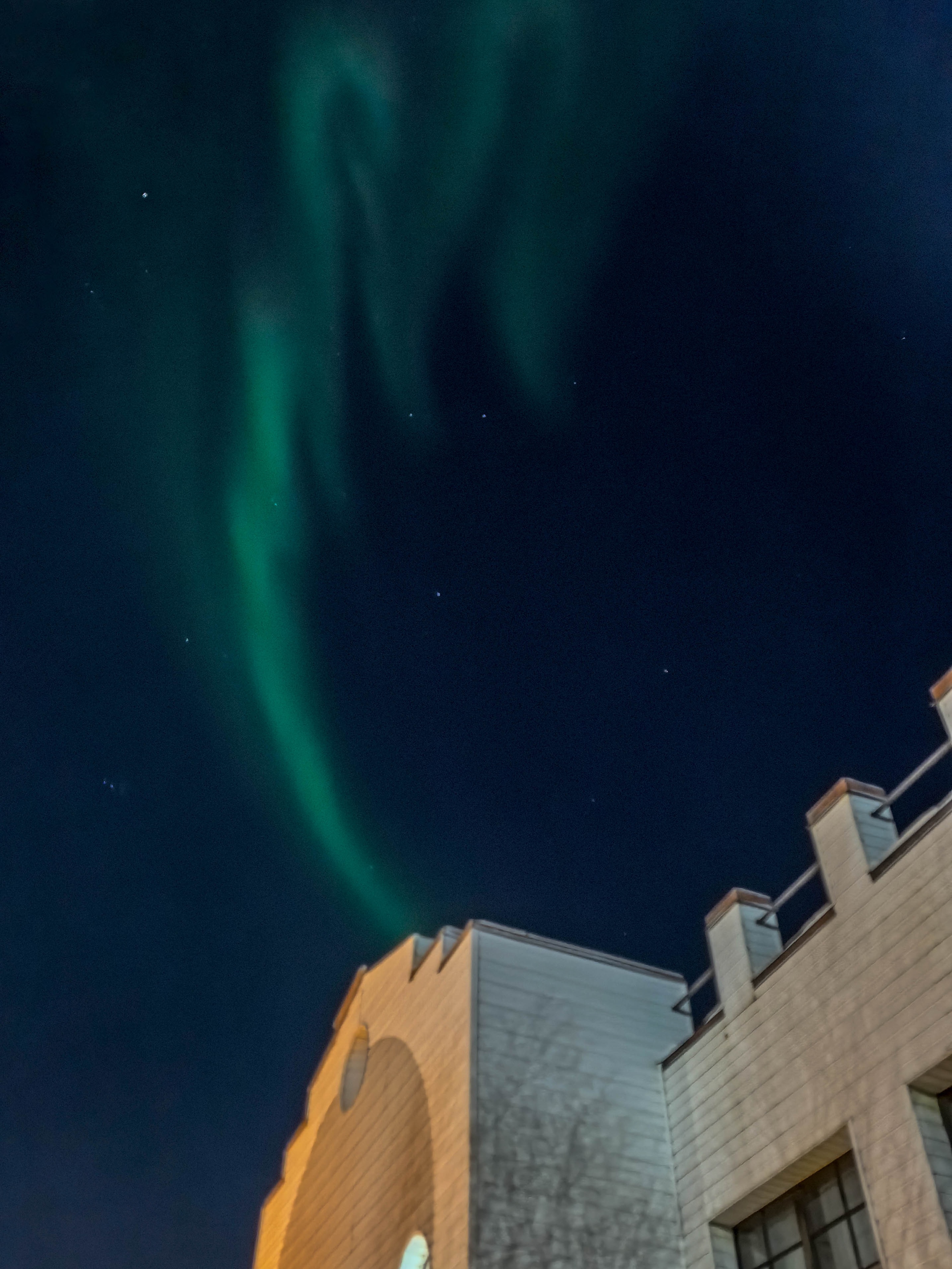 这并不是极光大爆发时天空被照亮的壮观场景,但也不存在很多人言之凿凿说的“极光是场骗局”——因为他们只看到了灰色的烟霭,从而确信极光只有在相机里才会呈现出绿色的光芒。极光的绿色确实是肉眼可见的,就在我们深夜返回在摩尔曼斯克城边小山上的酒店时,抬头望天,甚至看到了比在野外更为壮美的极光,巨大的绿色光带就在我们的头顶舞蹈。而推开酒店的窗户,则是绿色极光下,在平流雾里若隐若现的北方之城摩尔曼斯克璀璨的灯火。