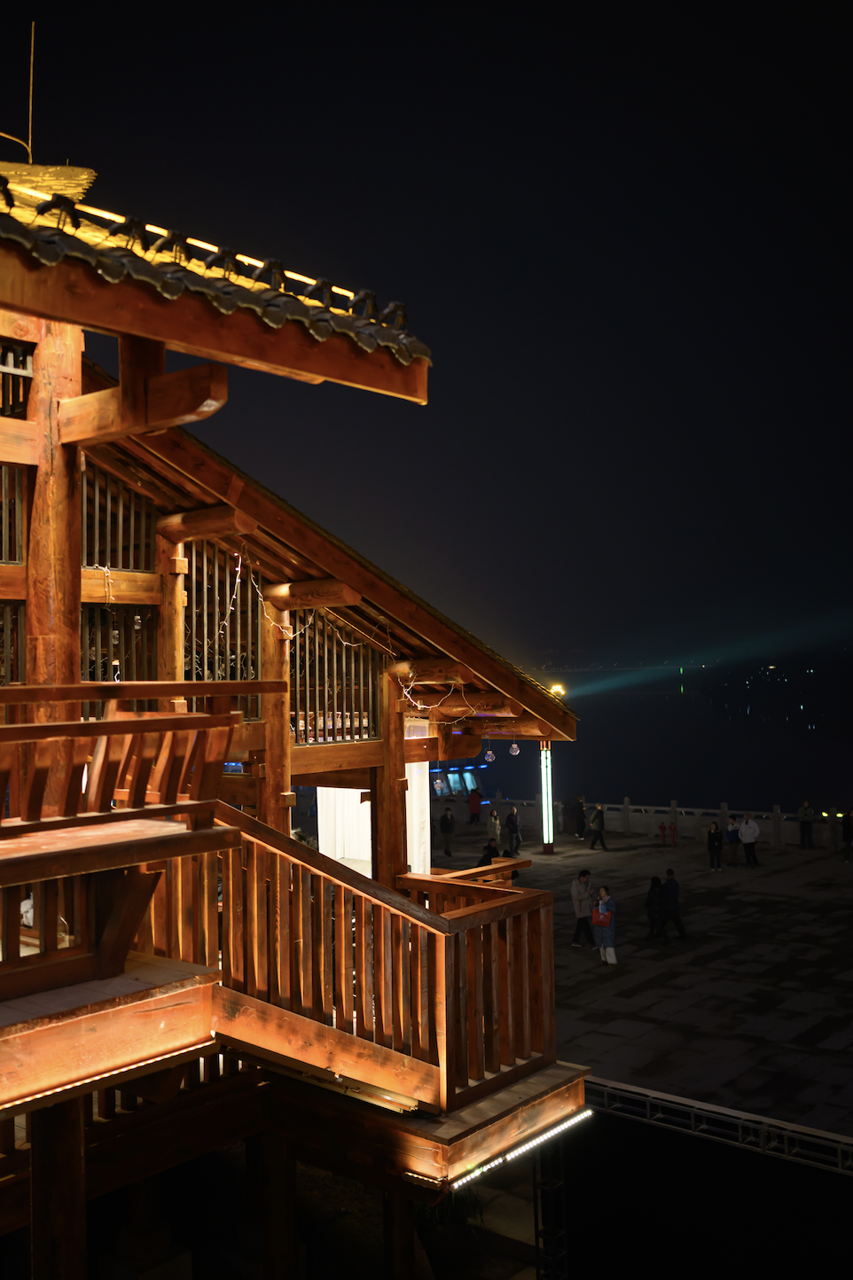 古建筑在灯光的映衬下,轮廓愈发清晰,被灯光点亮的吊脚楼,此刻仿佛从沉睡中被唤醒,透着白日里没有的灵动。