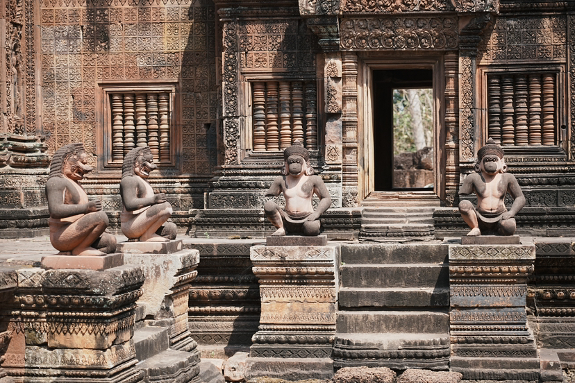 Banteay Srei ,又称班蒂斯蕾寺,位于暹粒市东北约25公里处。这座寺庙建于10世纪中叶,由罗贞陀罗跋摩二世Rajendravarman II)和阇耶跋摩五世(Jayavarman V)时期的贵族建造,以其精美的雕刻和红色的砂岩建筑而闻名。(与吴哥多数寺庙不同,修建者不是国王