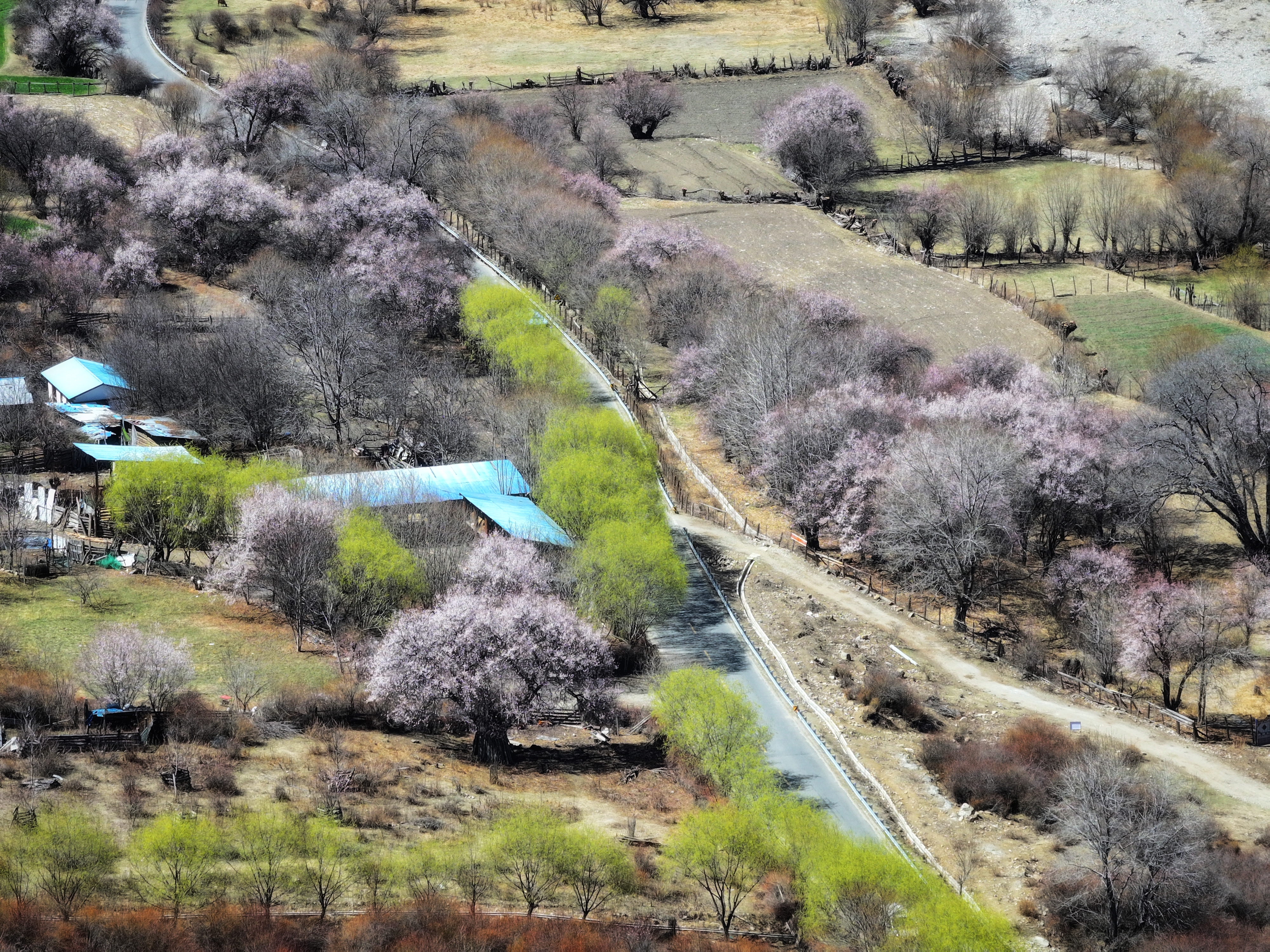 嘎拉桃花村,是林芝赏桃花的绝佳之地。每年三月下旬到四月中旬,这里便成了花的海洋。走进村子,仿佛踏入了一个童话世界。桃花簇拥着错落有致的藏式民居,青稞地在花海的环绕下,泛着嫩绿的光芒。微风拂过,花瓣如雪般纷纷扬扬飘落,洒在肩头、地面,空气中弥漫着淡淡的花香,令人沉醉。藏族同胞们身着鲜艳的传统服饰,在花海中劳作、嬉戏。孩子们在桃花树下追逐打闹,清脆的笑声在花枝间回荡。此时,人与自然和谐共生,共同谱写着一曲春日的赞歌。