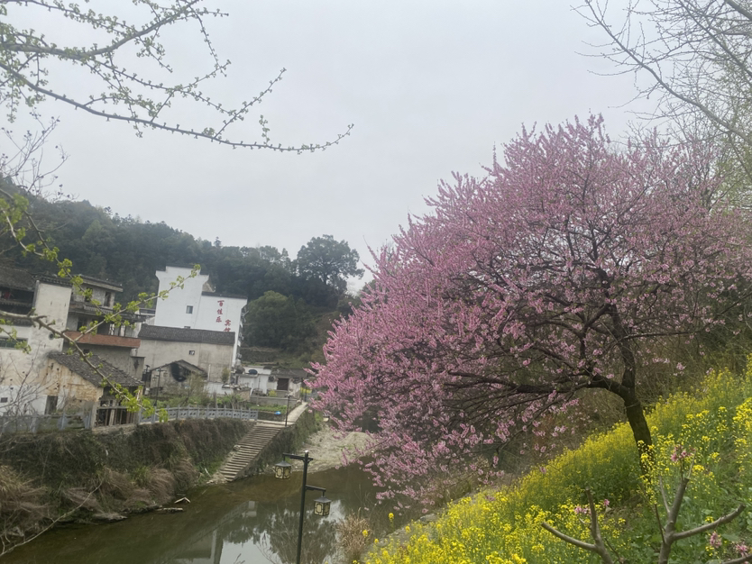村子古色古香,绽放的桃花,碧绿的河水,斑驳的黑瓦白墙交相辉映~路边还有人家晒的笋干~