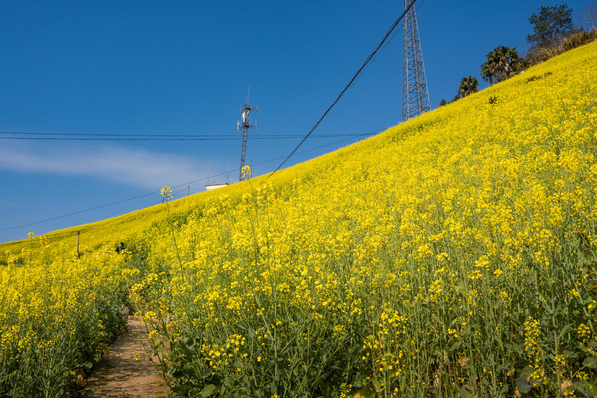 油菜花在山间肆意绽放,金黄的花朵汇聚成汹涌的花海