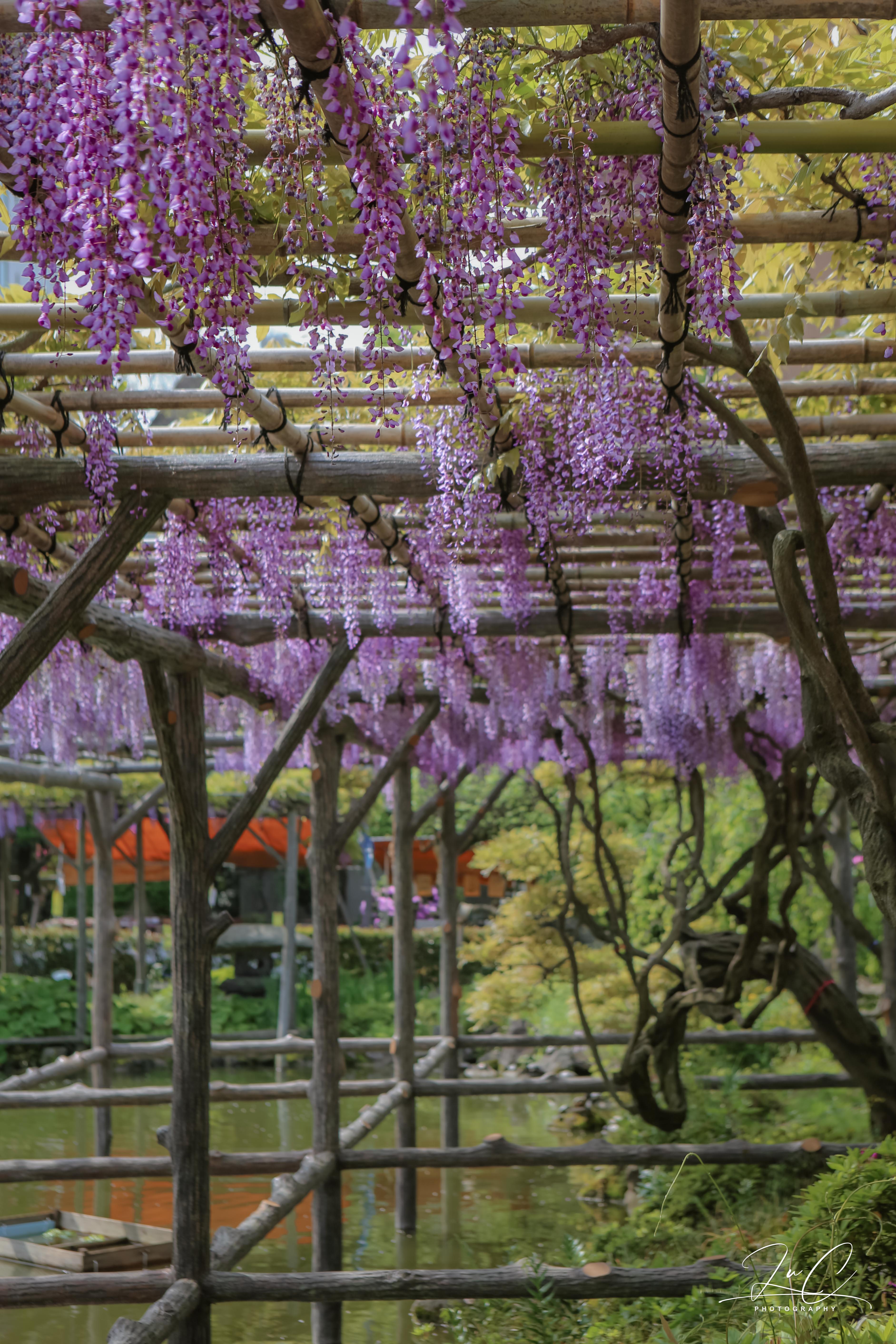 这是个私人的紫藤花园,每年只有紫藤花开的4月中-5月中和红叶满山的11月中-12月中对外开放。园内共有22种、共计150株紫藤树,如野田长藤、口红藤等,但难得的是大部分的藤都很大,所以看上去非常震撼。