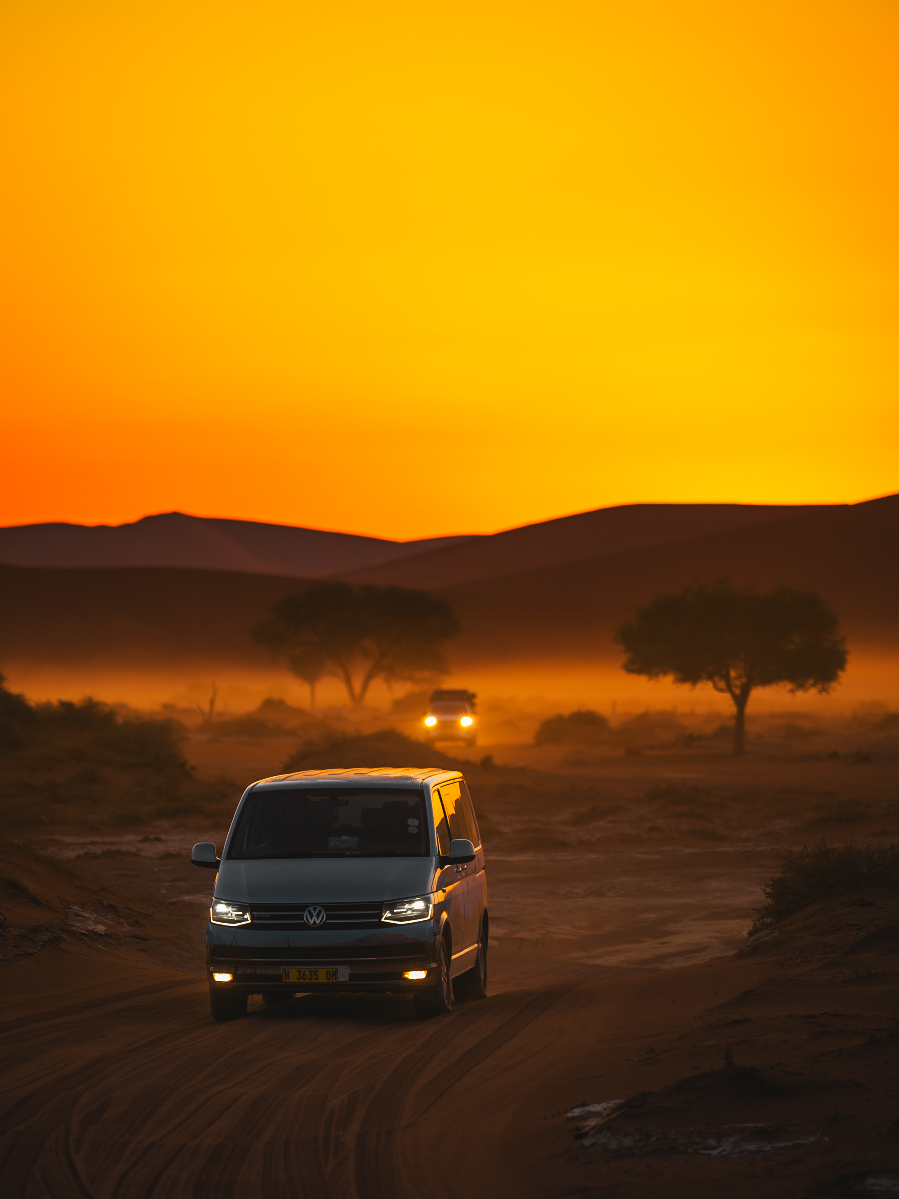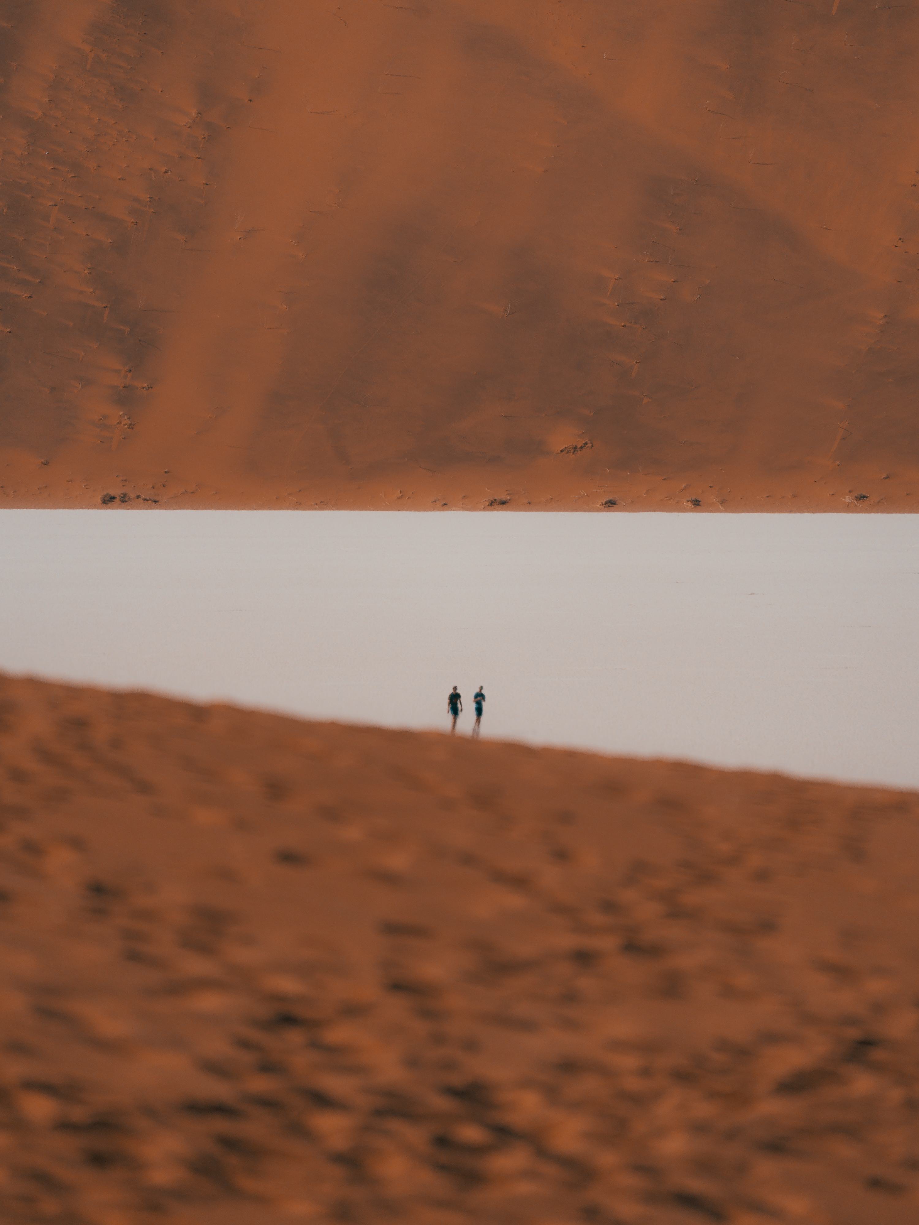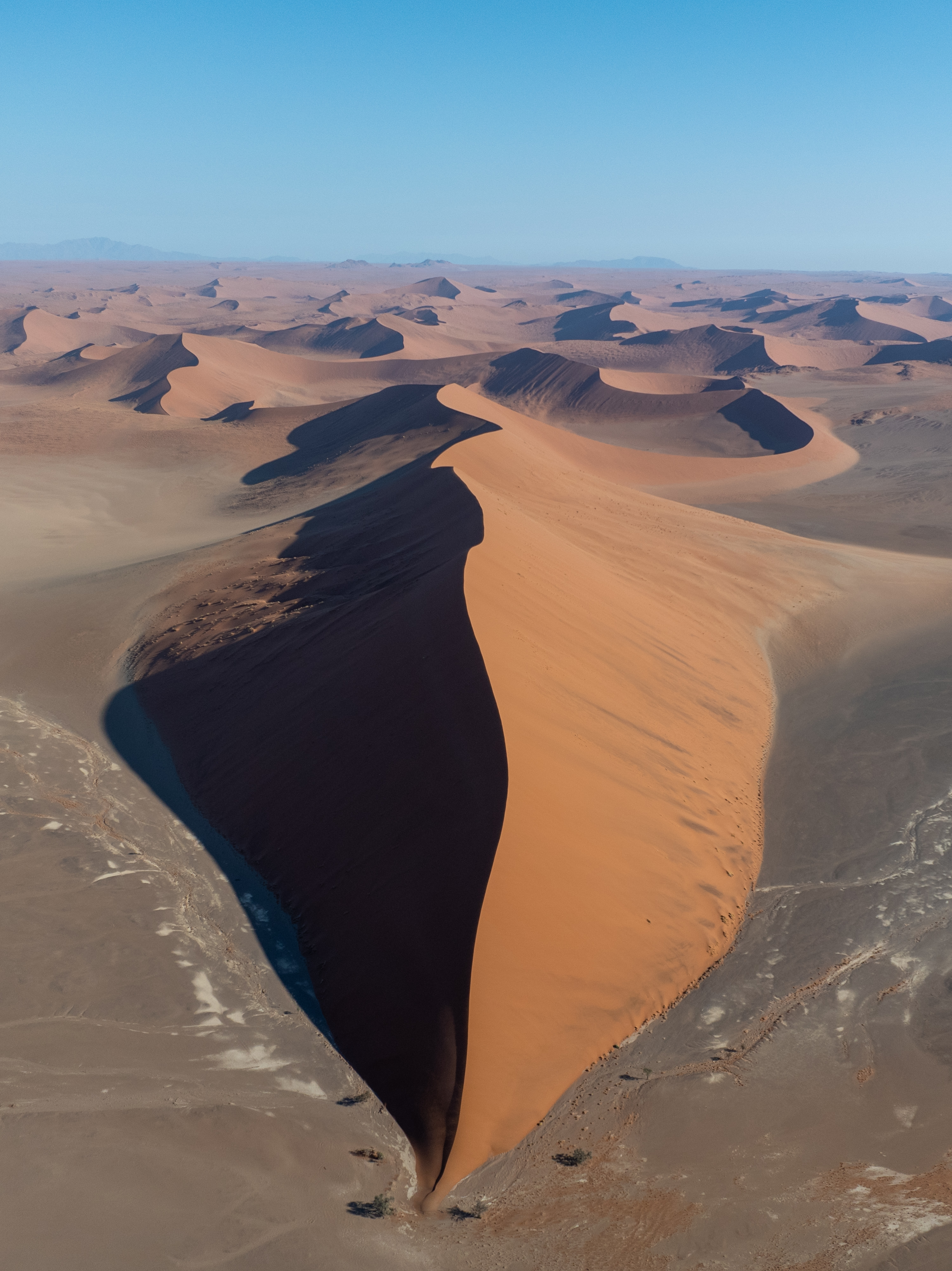45号沙丘是世界上最上镜的沙丘之一,高达170米,S型曲线在晨光中如同燃烧的火焰。沙丘的阴阳两面形成强烈对比,背光面呈现深葡萄酒红色,迎光面则是耀眼的金黄。