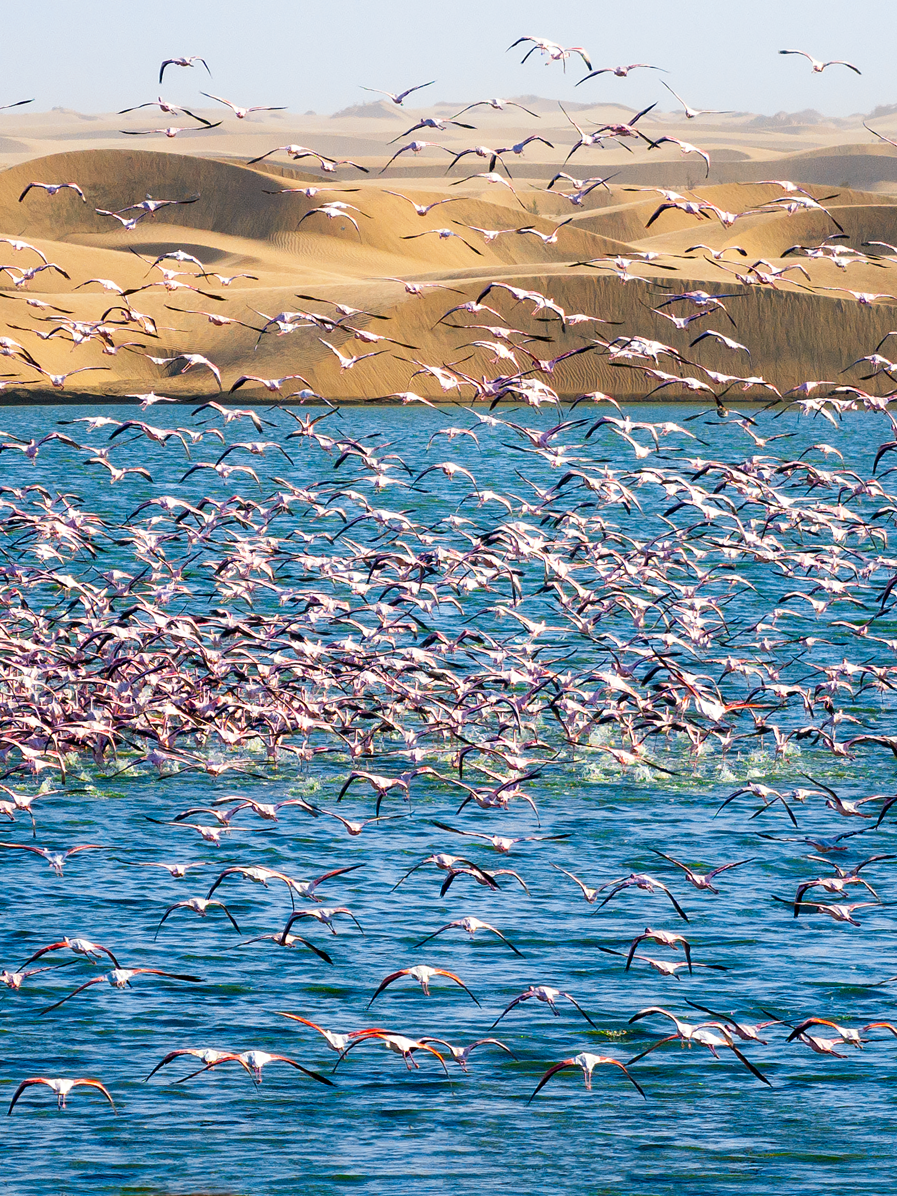 鲸湾的潟湖是火烈鸟的栖息地,成千上万只粉色火烈鸟在此觅食,场面壮观。