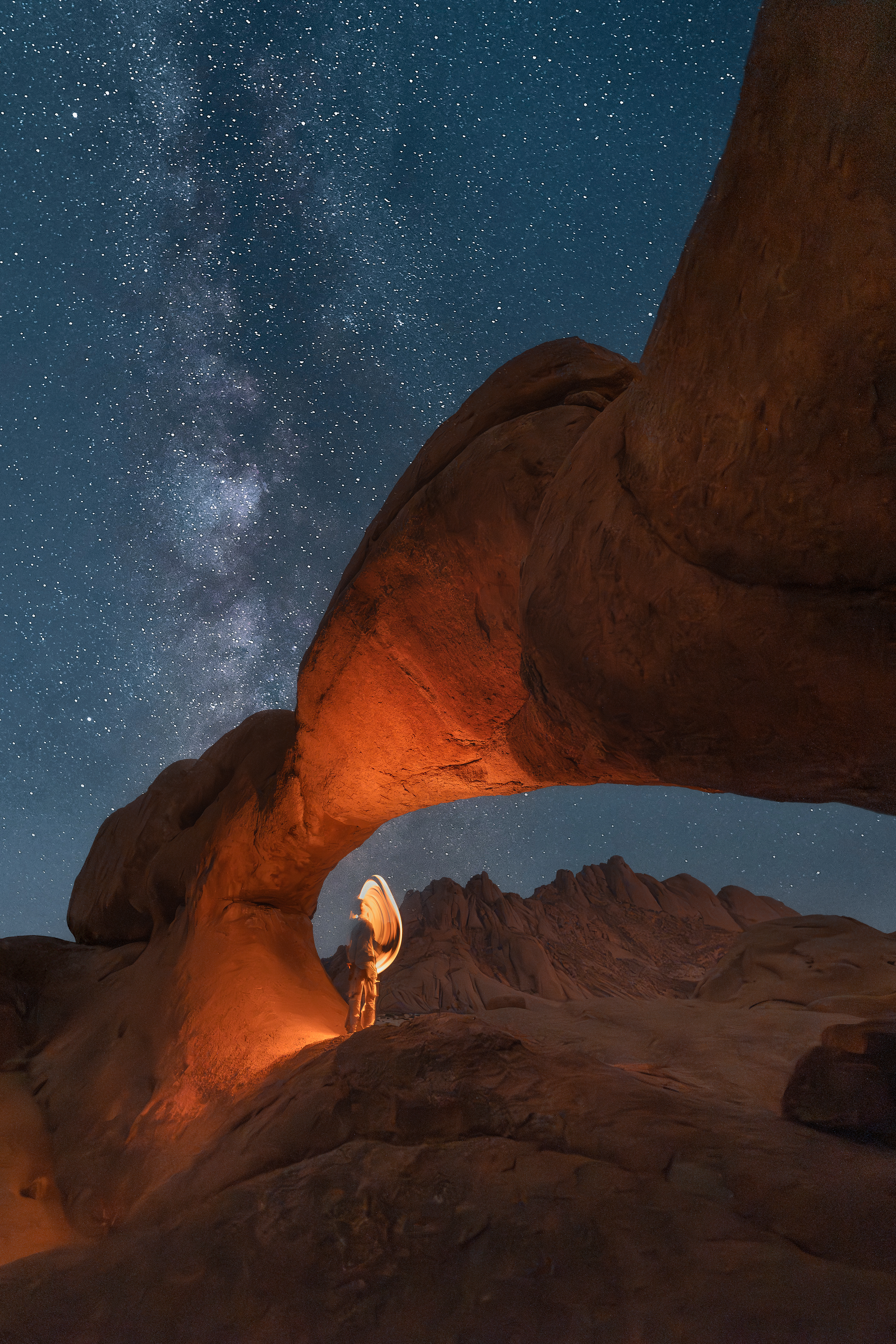 在Keetmanshoop附近的这片私人农场,三百余株箭袋树(Quiver Tree)以超现实的姿态刺向南天银河。我采用"天地双曝"技法: