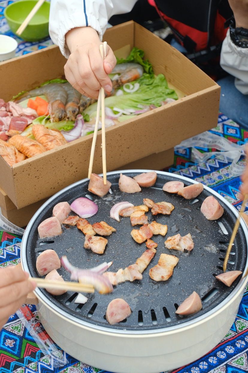 傍晚在海边营地,体验特色烧烤,搭配的惊喜美食是超级香的焖饭,虽然落了点小雨,但是我们在海边营地布置了露营灯、天幕,体验感满满。篝火晚会、放烟花、荧光棒、超近距离演唱会,大家都意犹未尽,超开心!