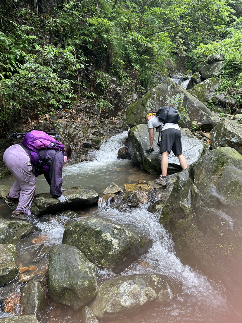 线路分两部分,前半部分在原始森林的石头中穿越,后半部分半公路半土路徒步。峡谷中溪水流淌,瀑布直流而下,沿着峡谷中大大小小石头而上,趣味十足。有时候直接蹚水而过,有时候需要跨越石头跳跃,有时候需要抱石头,有时候需要观察环境,挖掘不需要湿鞋的线路。一路上听着水流鸟鸣,抬头望去没有蓝天碧云而是森林里乱倒的竹子或者树木,真是与世隔绝之感啊。5月中旬的气温虽不高但是有点闷热,峡谷中被丛林包裹无凉风拂过,只能捧点溪水洗把脸或者直接蹚水来消除热感。峡谷中没有特别难的点,基本不好走的地方都有铁链和钢筋辅助,雨后石头稍微有点滑,穿过峡谷来到了水库,这个山顶水库暂时在施工建造无缘见到绿色的水潭。四明山一年四季都漂亮,现在山顶还有些红枫叶,风景特别美。后半程在山顶盘山公路感受眺望的美景,然后经过四明山地质公园后就下坡穿到杂草和树木中。