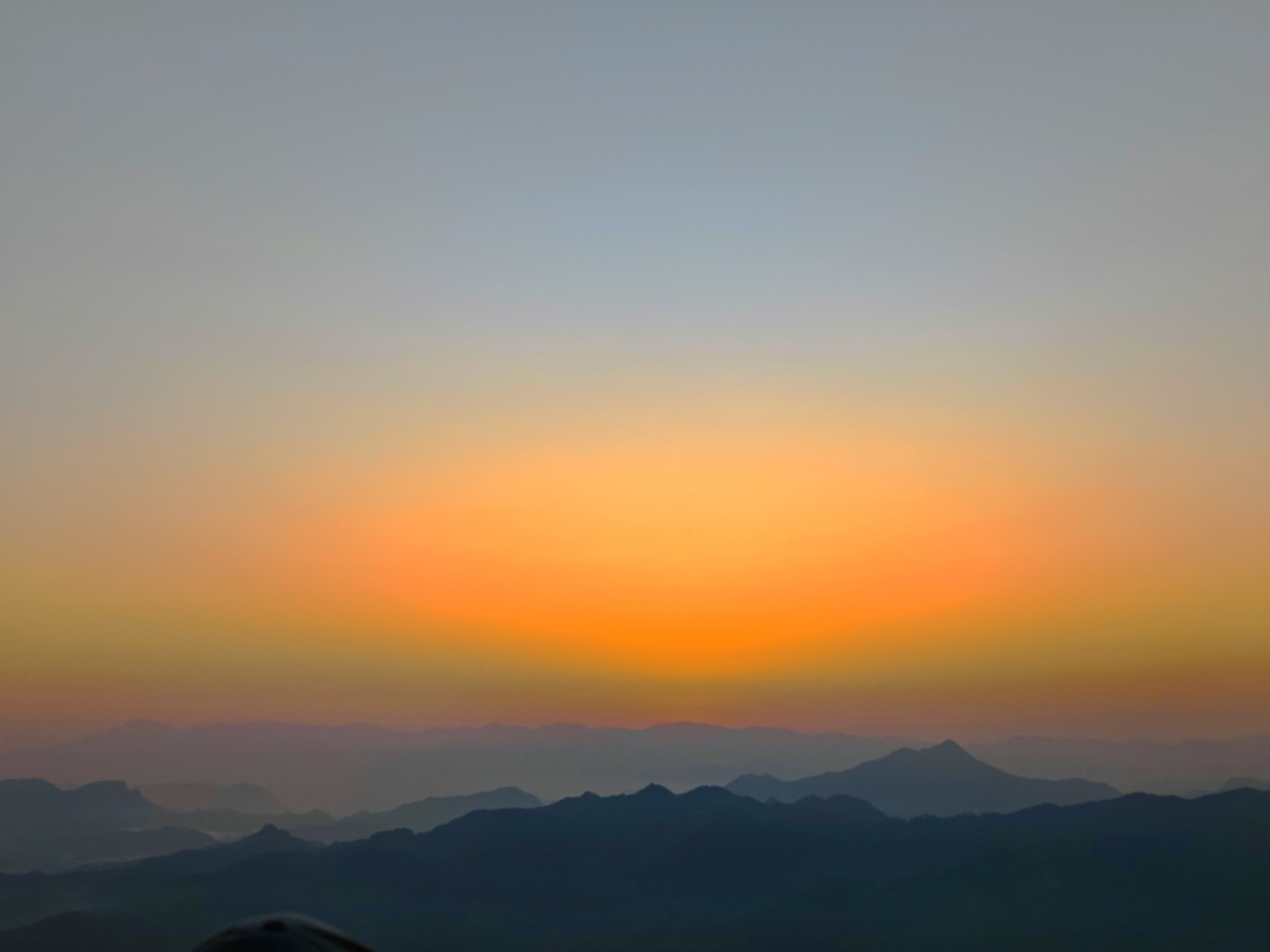 时间在悄然间一点一滴的过去,太阳也漏出了头角,在远方的天色中,红的像一团熊熊燃烧的火焰,照亮了天际,也照亮层层的山峰,透过黝黑的云层,一点一点的上升,从露出弯弯的小角儿不大一会就变成了半圆,没多大的功夫后,就是完整的圆通通的红太阳一览无遗的呈现在眼前,没有任何的遮挡,没有任何的杂物,上方是染红了的天空,像是平整的结红色的丝巾,下面是层峦起伏的山川,一层山又一重山,正中间便是红的发亮的冉冉升起的太阳,耳边的手机拍照声从未间断过,记录美好生活也是享受生活的一部分,可手机的拍照只在一瞬间的定格,却无法扑捉它真正的真实的平凡的美,此时此刻,这山川锦绣,这大好河山,这红日如海,我们通过眼睛所能看到的,欣赏的,或许就在那片刻之间,什么也不能带来,什么也不能带走,真正美好的东西是无法拥有的,能拥有的是对美好的一种感受,我想这就已经足够,太贪心会增添烦恼,太执着会徒添痛苦,放下手机,静静地看着日出升起,在云层中向上移动,感受山顶上清凉的晨风和湿润的空气,每一次呼吸都是一种舒适的享受,放下诸多的想法,就用身心去享受这一刻,最单纯的,最自然的,最简单的大自然赋予的美好,景意可相通,天人亦合一。