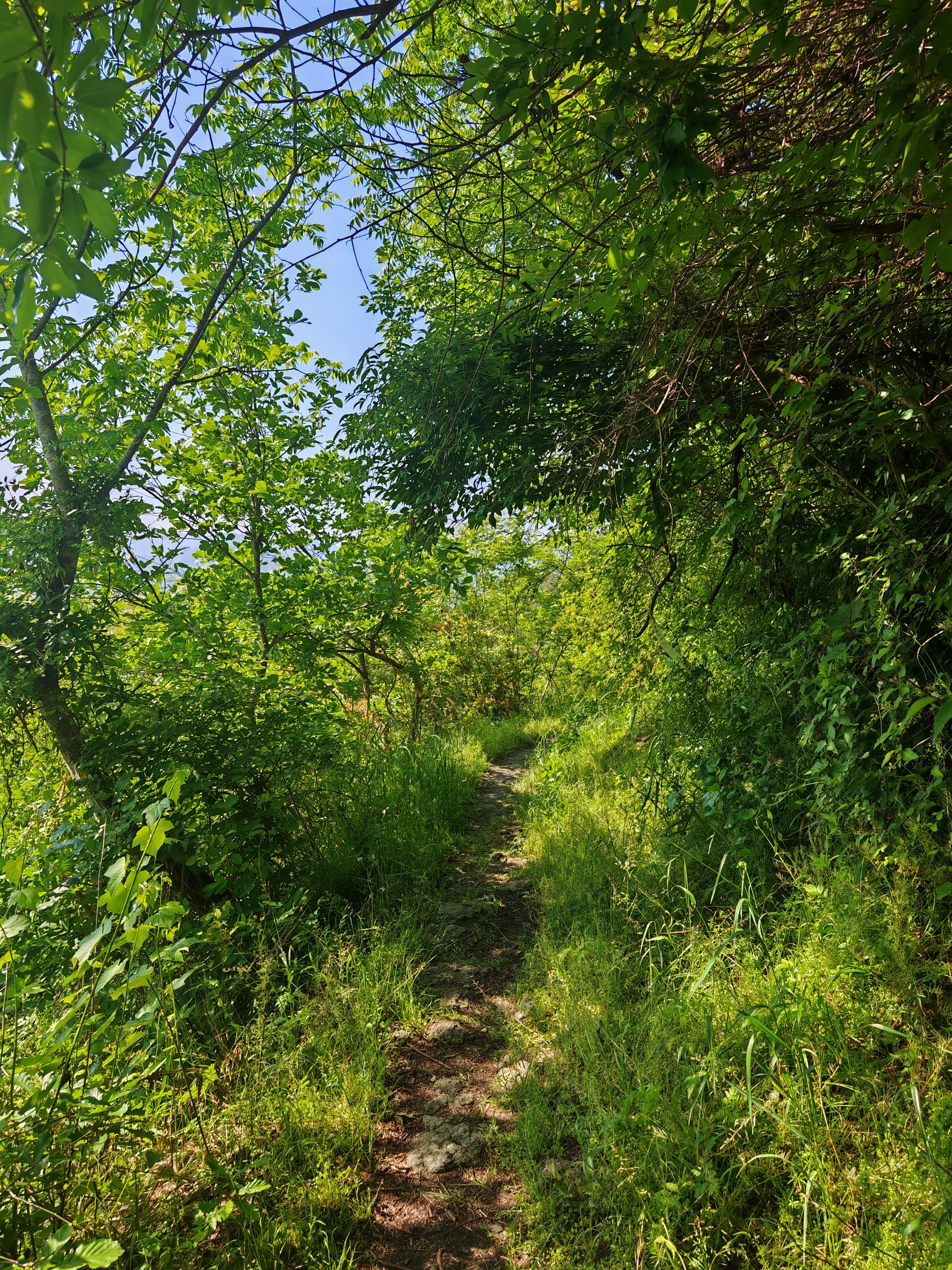 没有再走回头路,选择另外一条路线下山,因第一天黑夜上山没有看到太多景色,下山则预留了充足的时间,可以沿途停留,沿途游玩,不设有太多的计划,就根据心情享受下山行程。道路依旧是狭小的,只能一个人通行,植被是茂盛的,放眼四周都是绿油油的一片,近处是疯狂生长的小草,旁边则是层次不齐的树木,踩在泥土上,松软的程度带来了恰到好处的回弹,让整个行走的过程没有劳累和痛苦,更能有一种似悠闲散步的享受,树木包裹的小道,隔绝了太多光亮的阳光,只透过树木间隙洒落了部分柔光,不刺眼,不闷热,气温恰到好处,偶尔会有风从树木中穿过来,凉爽又舒服。
