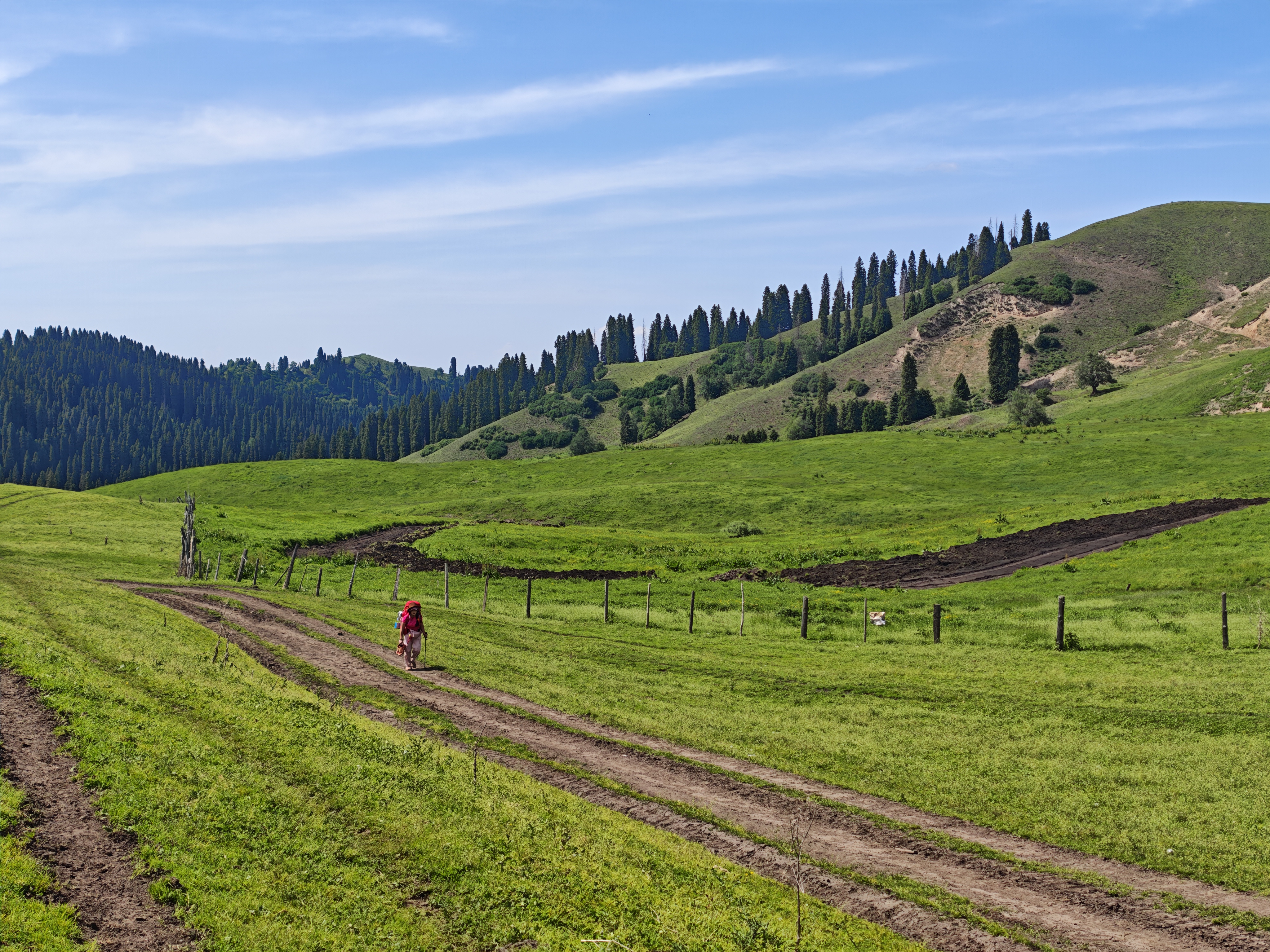 早餐后出发,一段一段连续的缓上坡,我们亦步亦趋、愈行愈上,努力往白云和草原的深处徒步。经塔里木森林公园后,行进在曲线状的塔里木草原上,散布的牛羊时而跌入谷中,时而悬于天地错落有致,天地万物融于景中、浑然天成。恰西海拨1500米,冬暖夏凉,气候宜人背靠雪山,但是这儿草原上的野花明显少了。“塞上江南在伊犁,伊犁最秀是恰西”,这是在当地流行的一句话。
