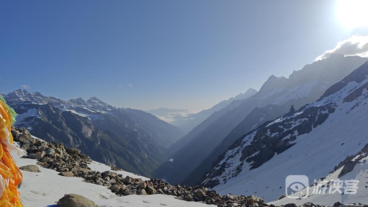 当东方天际泛起第一线灰白,我们终于挣扎着踏上4660米的垭口。狂风如失控的巨兽,裹挟着雪粒狠狠抽打在脸上,几乎站立不稳。然而回望——长坪沟的千沟万壑仍在沉睡的暗影里,云海翻腾,如凝固的白色怒涛,簇拥着远方的雪峰。而前方,毕棚沟壮丽的画卷在晨曦中徐徐展开:刀锋般的山脊切割着云层,冰川的幽蓝在阳光下闪烁,盘羊湖如同遗落山间的翡翠。昨夜炼狱般的攀爬,此刻被这无与伦比的辉煌瞬间赋予了神性的意义。阳光刺破云层,点燃了雪坡,点燃了脸庞,也点燃了几乎熄灭的心火。向导催促下撤的呼喊在风中破碎,我们贪婪地攫取这天地大美,将这用极限换来的片刻,深深烙入灵魂。