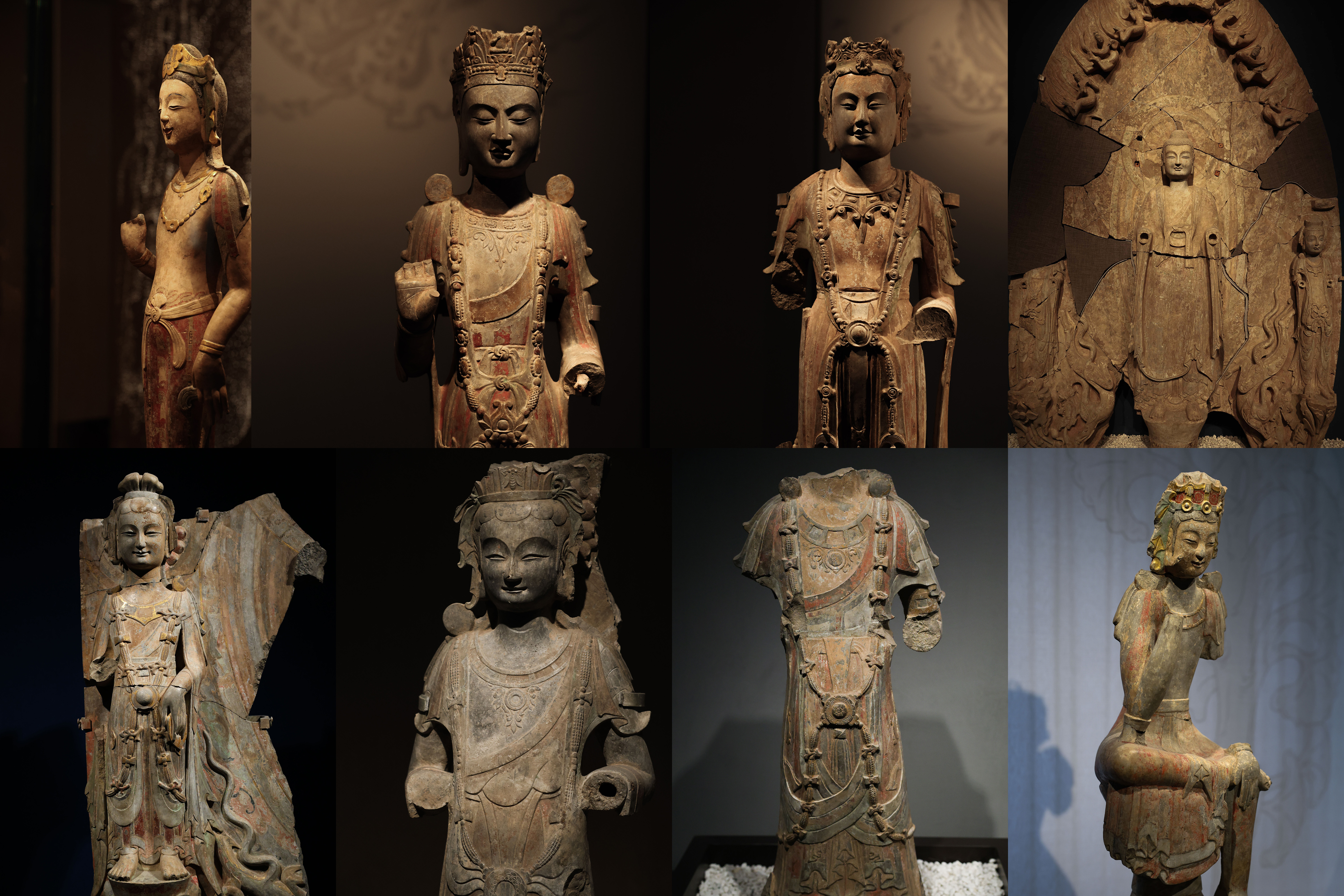 青州龙兴寺创建于南朝刘宋,历北魏、东魏时期发展,于唐宋达到鼎盛,明代洪武年间湮灭。1996年,这里出土各类佛教造像400余尊,跨越北魏到北宋近500年,贴金彩绘保存完好。有别于寻常所见造像的“庄严”,南北朝时期青州地区的工匠们对佛像、菩萨像面部的刻画所呈现出来的面部观感更为柔和与亲切,成就了这批“青州微笑”佛造像。