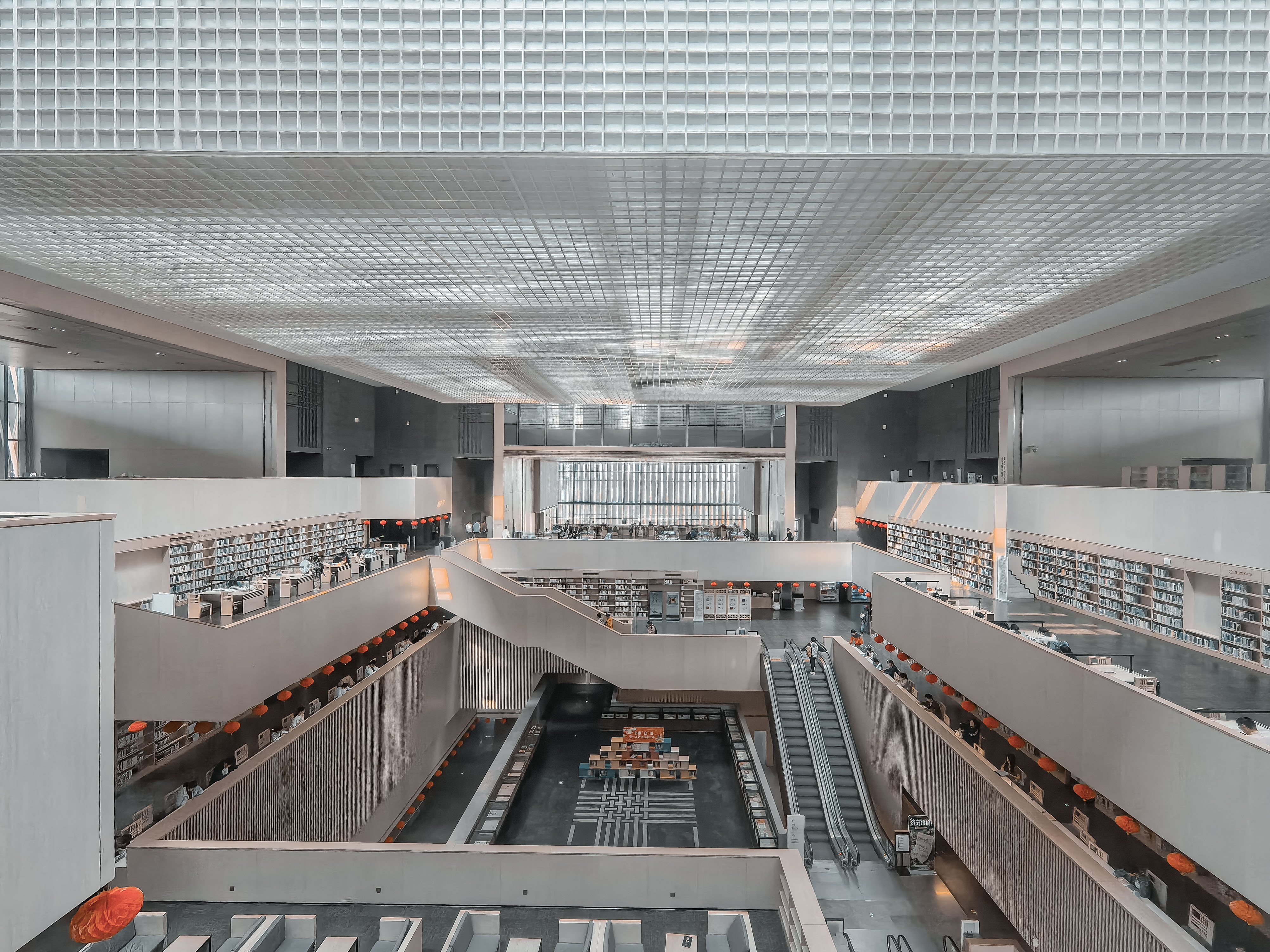 何镜堂院士的作品!也是这组文化建筑里我最喜欢的。图书馆以“孔孟之乡,礼制书传”为设计主题,将“明堂辟雍、四面八方”的古典理念融入现代建筑之中。高台作为文化平台的象征,被巧妙地转化为高地公园与绿坡,通过连桥与图书馆主入口大厅相连通。建筑内部,中庭开阔向天,宛如倒置的明堂负型。中心设立的杏坛与四周体量组合的突出和凹进相映成趣,形成了退台式的阅读空间,既实用又富有韵味。