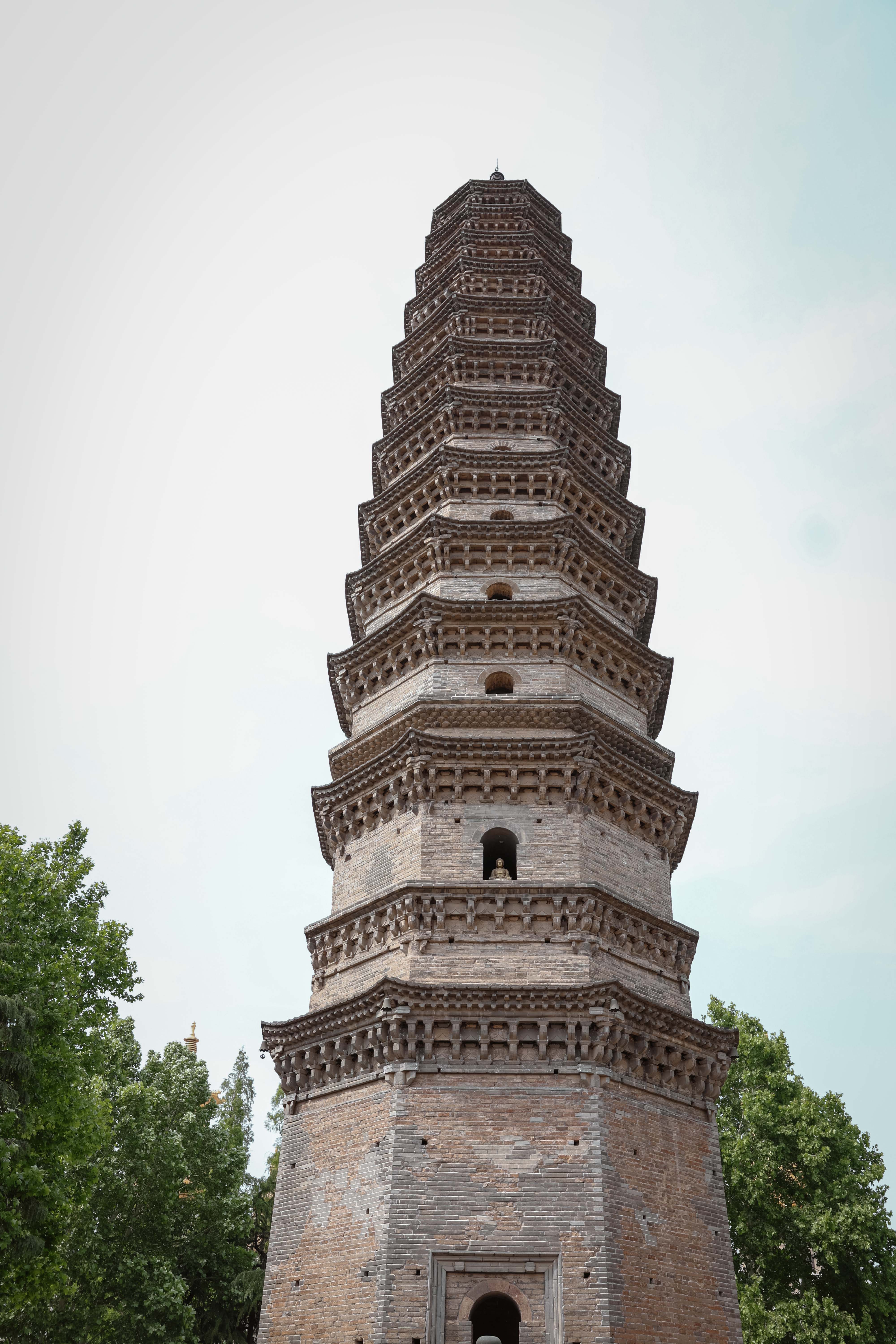 辟支塔,8角9层12檐的楼阁式建筑,据考证创建于宋代。辟支佛是梵语音译,意译为“缘觉”、“独觉”。是三乘(声闻承、辟支佛乘、大乘)之一,指无师而能自觉自悟之圣者。塔基上的浮雕刻的是古印度孔雀王朝阿育王皈依佛门的故事。