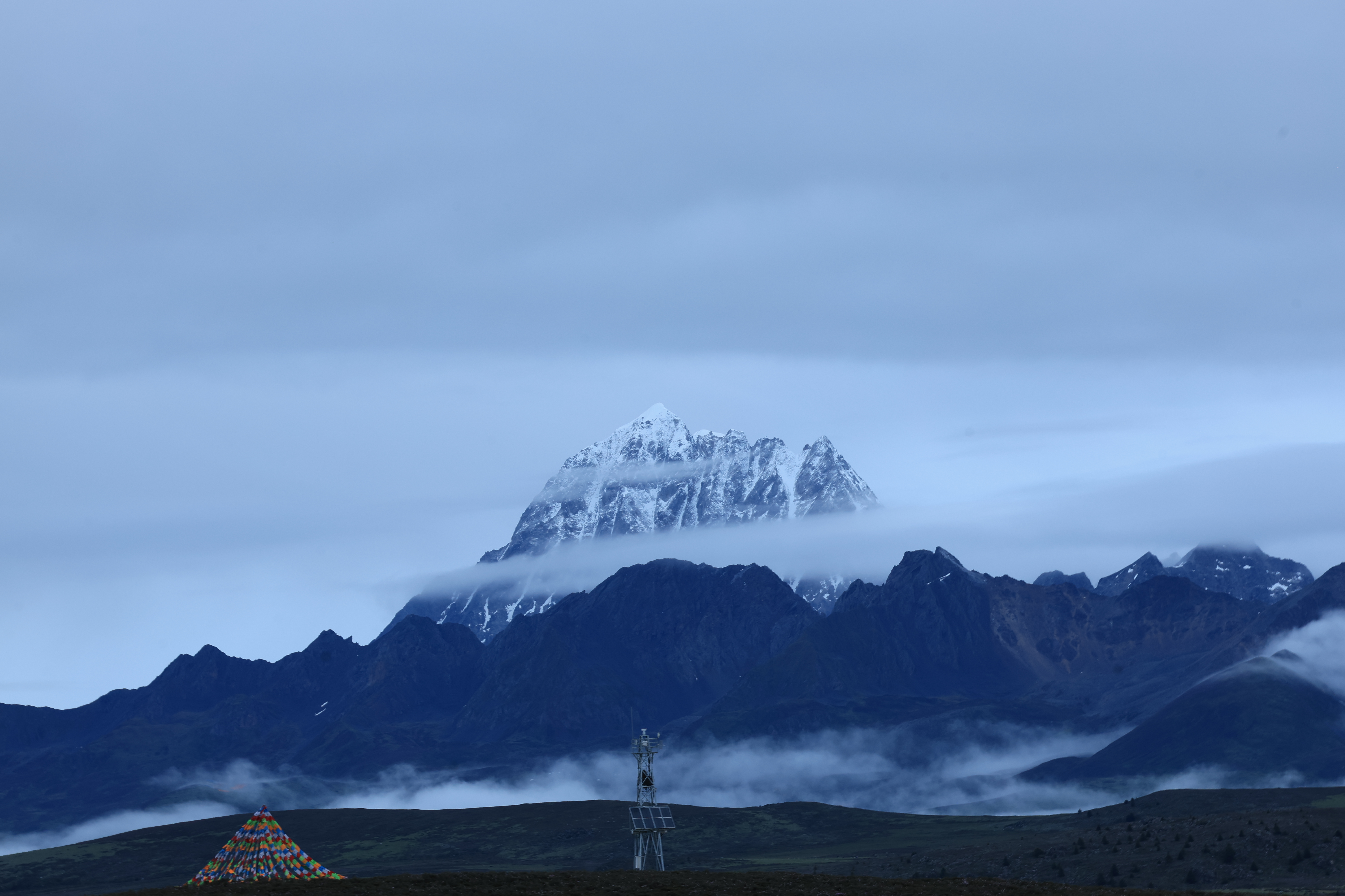 车过海子山,天色骤然暗沉下来。千万只冰冷的箭镞自穹顶倾泻而下,砸在挡风玻璃上爆出碎裂的银花。雨瀑冲刷着古冰帽的苍老褶皱,碎石路瞬间化作幽暗的玉带,车轮碾过水洼,激起浑浊的浪涌,好似唤醒深埋地底的牦牛古魂。雨刮器在玻璃上徒劳地描画着“**”字,前方道路朦胧,唯见青绕神山铅灰色的山脊如巨兽脊背在云中沉浮,偶尔露出一块铁青的岩骨,是它磨秃的旧齿痕。