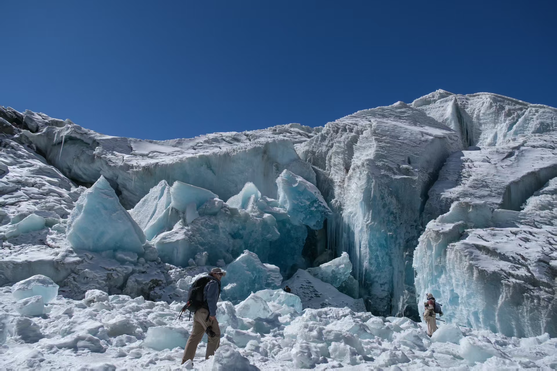 近观冰舌末端,则是另一番景象。冰川下部覆盖着灰黑色的表碛物,但断裂的冰崖处,暴露出的冰川冰体呈现出深邃纯净的幽蓝色,那是万年古冰在极致压力下形成的独特质感。冰川底部消融活跃,形成了深邃的冰洞、迷宫般的冰裂隙和嶙峋的冰塔林轮廓。冰川融水在底部汇集成冰碛湖,湖水因富含岩粉而呈现出梦幻的奶绿色或乳蓝色,静静映照着上方森然矗立的巨大冰墙。