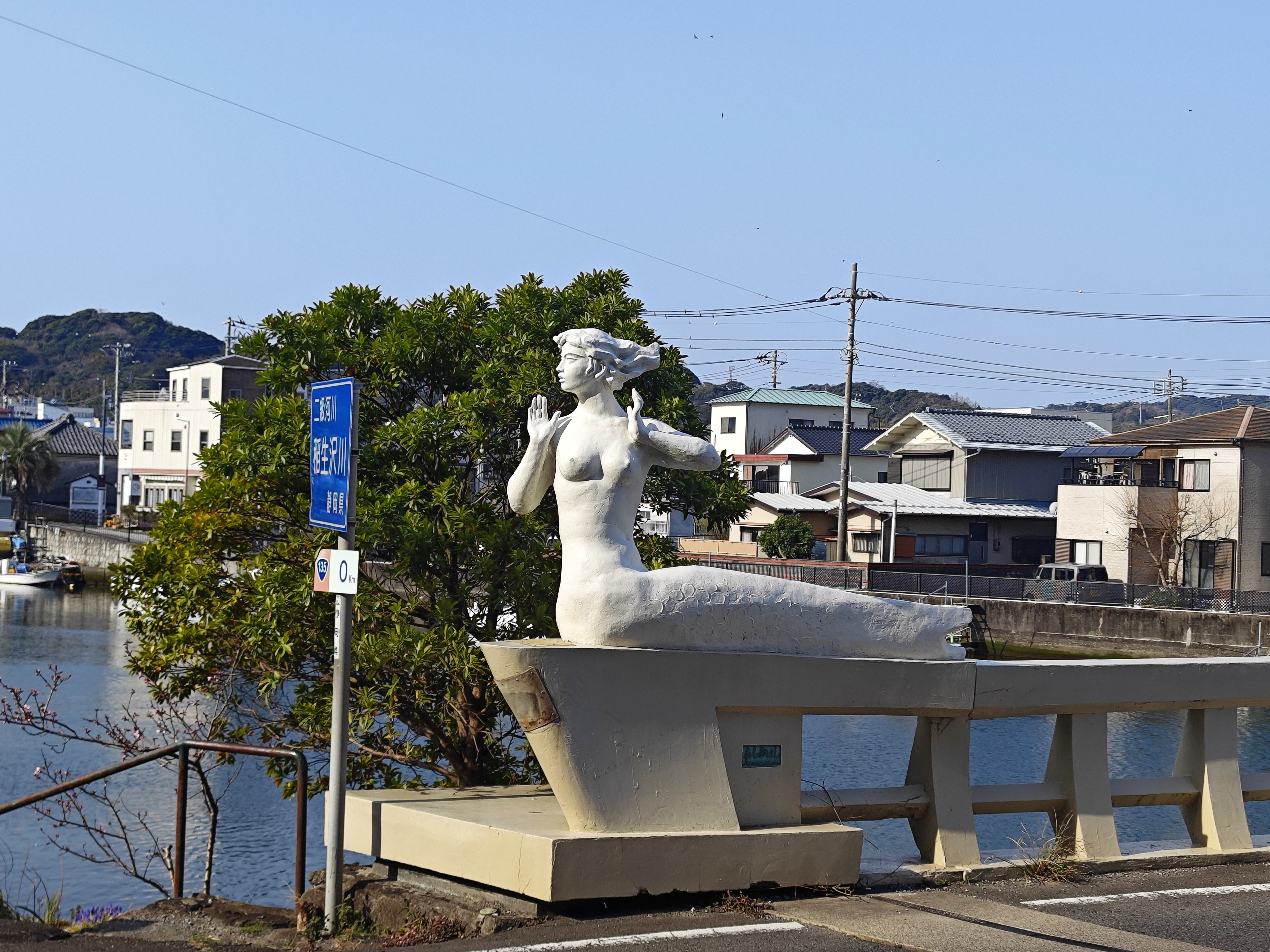 补充了能量后,同伴还要继续休息,我独自沿稲生沢川岸边向大海的方向走去。这一路景色挺美,我最后登上一座有陆桥相连的小岛,拜了鱼神。期间看到一艘“黑船”载着游客向出海口驶去。