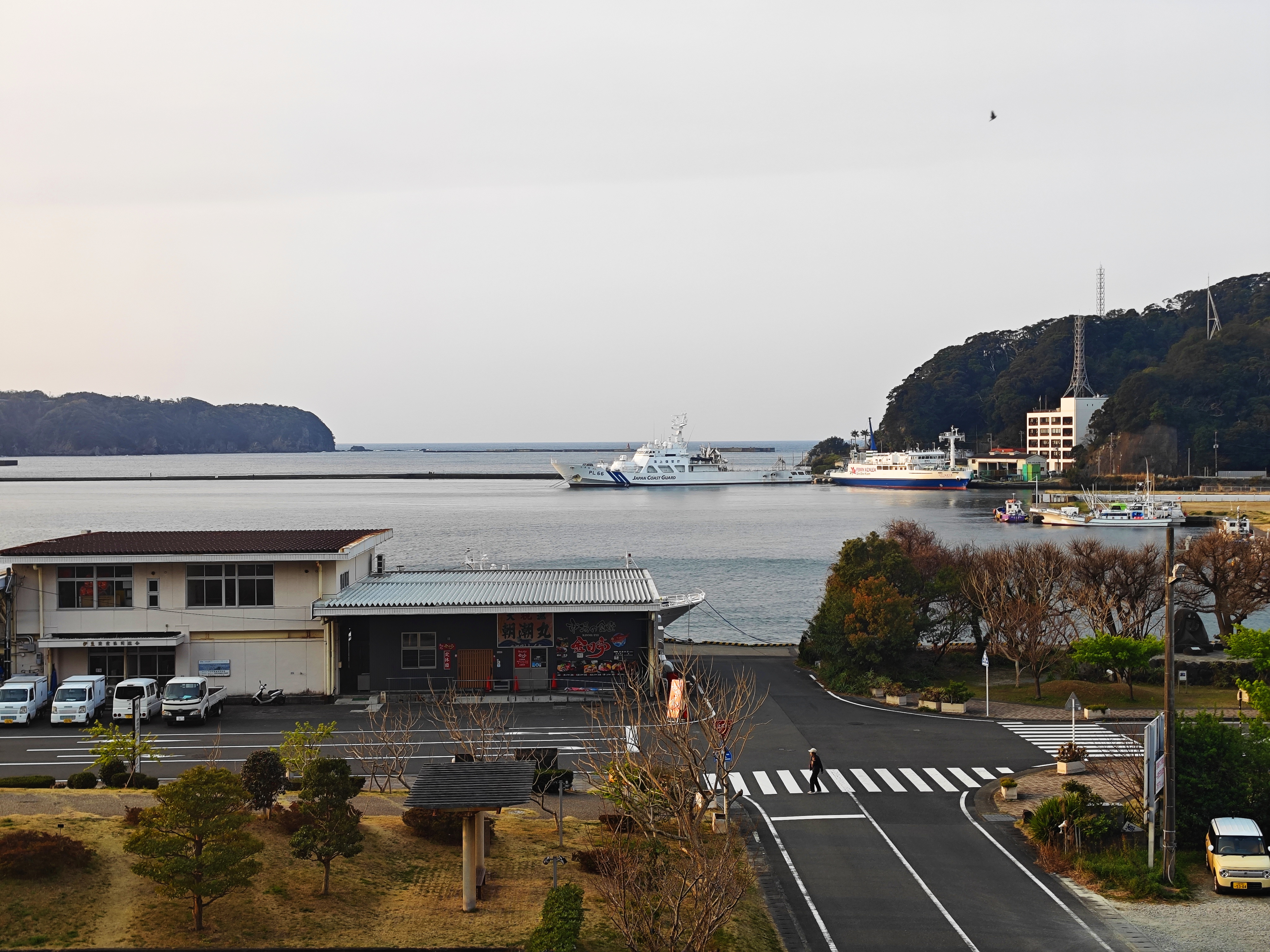在超市购物后,已近下午5点,我们回到旅店。我们的日式房间很大,有独立厕所,还是海景房,直面海上保安厅的泊位,但浴室共享。火车站到此有巴士,两站路。