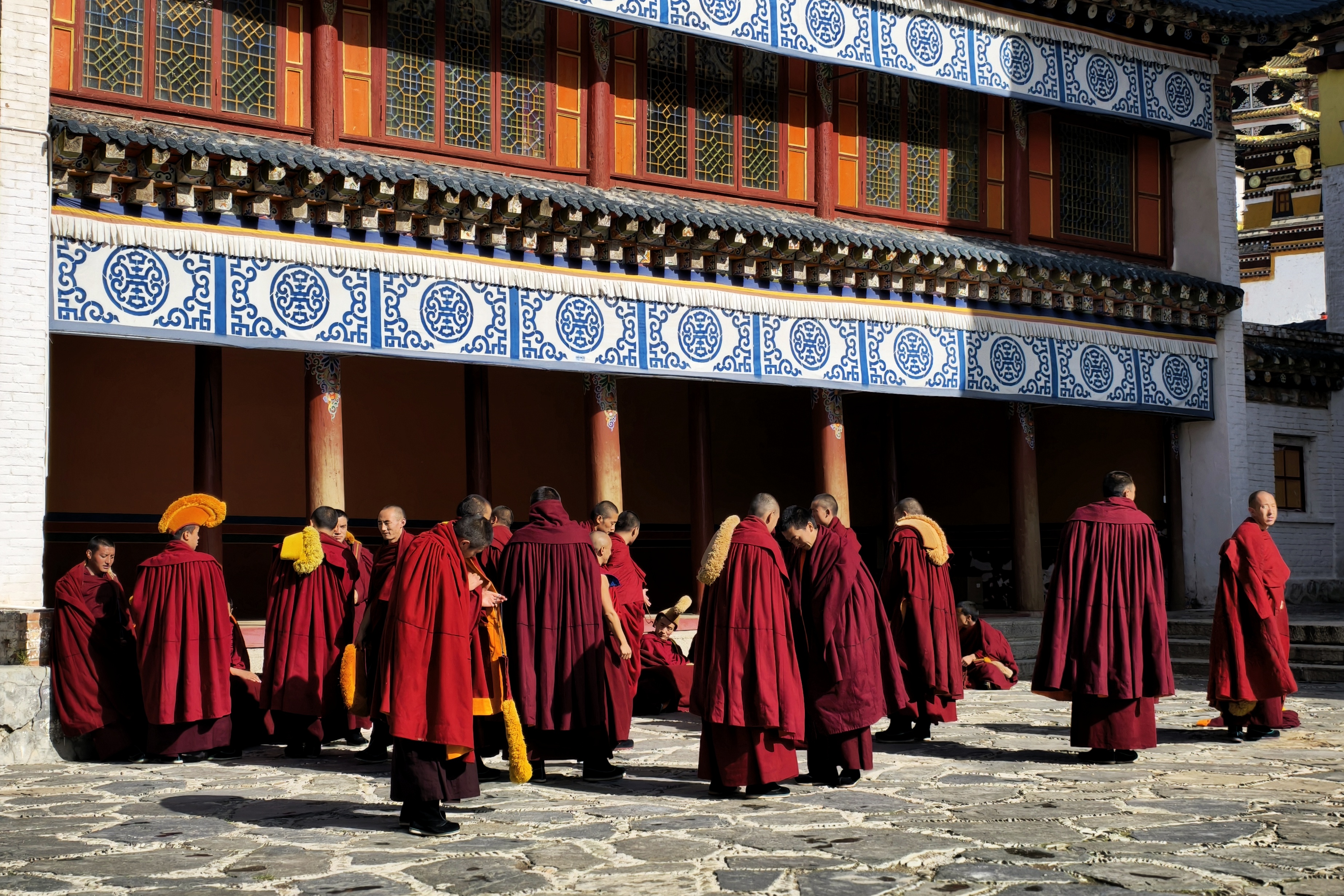 大经堂前的广场上,几个小喇嘛正追逐嬉戏,紫红色的身影在金色的法轮旁跳跃。忽然一阵法号声响起,他们立刻敛了笑容,规规矩矩地站成一排。阳光穿过弥勒佛殿的金顶,在地面投下菱形的光斑,与酥油花的冷香缠绕成结。登上贡唐宝塔俯瞰,整个寺院像铺展的坛城,晒佛台在远处的山岗上沉默如谜,据说每年正月十三,这里会展开百米长的唐卡,让众生得以仰望佛的容颜。