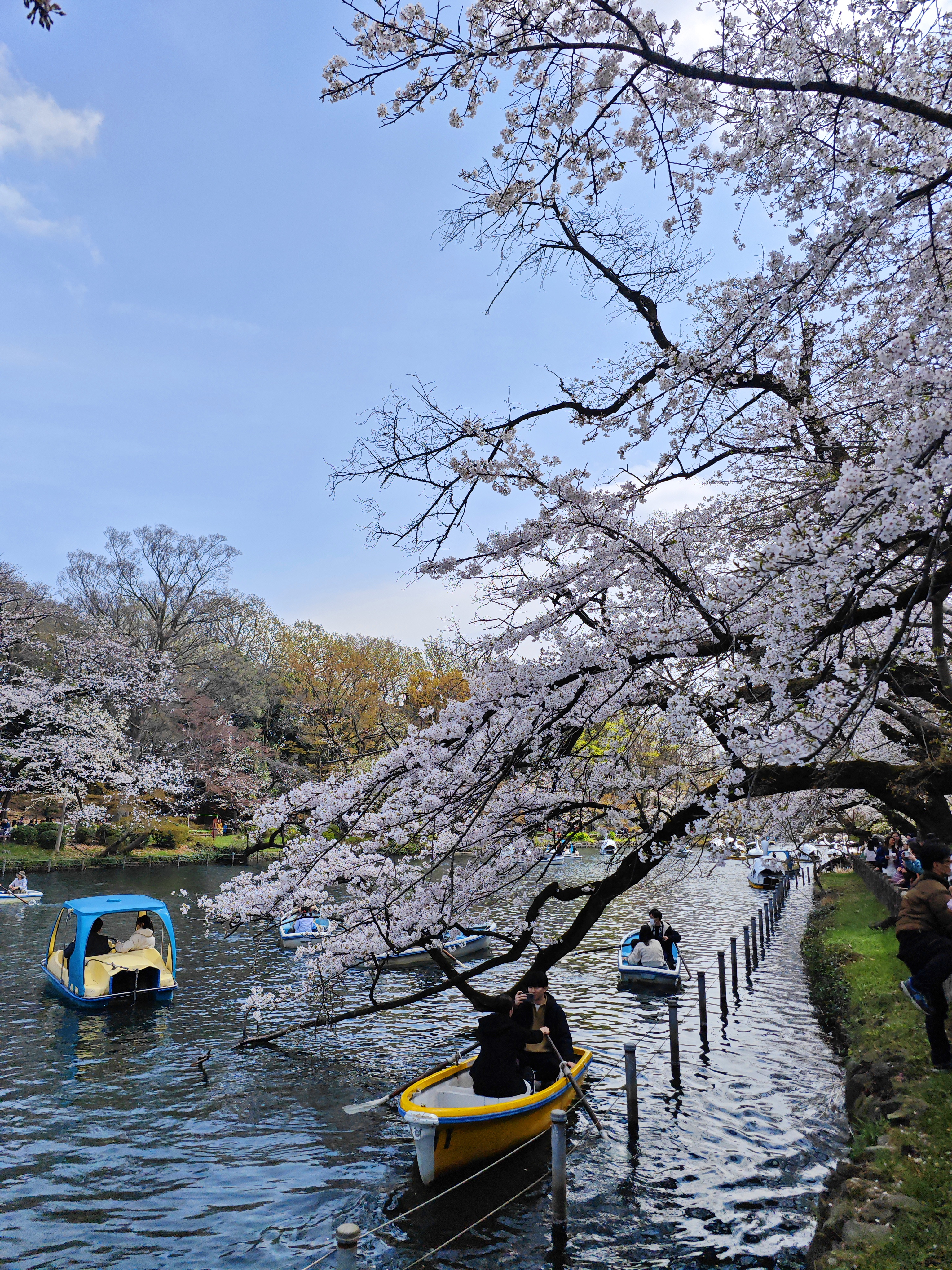 我们上午10点半坐地铁来到井之头公园。樱花进入盛花期,又是周末,游人真多。日本民众拖家带口,带着食物饮料,有的还扛着气垫、椅子,到公园安营扎寨。井之头的樱花树非常高大,数量多,蓝天白云下,很美丽。园内的湖上,天鹅船往来穿梭。