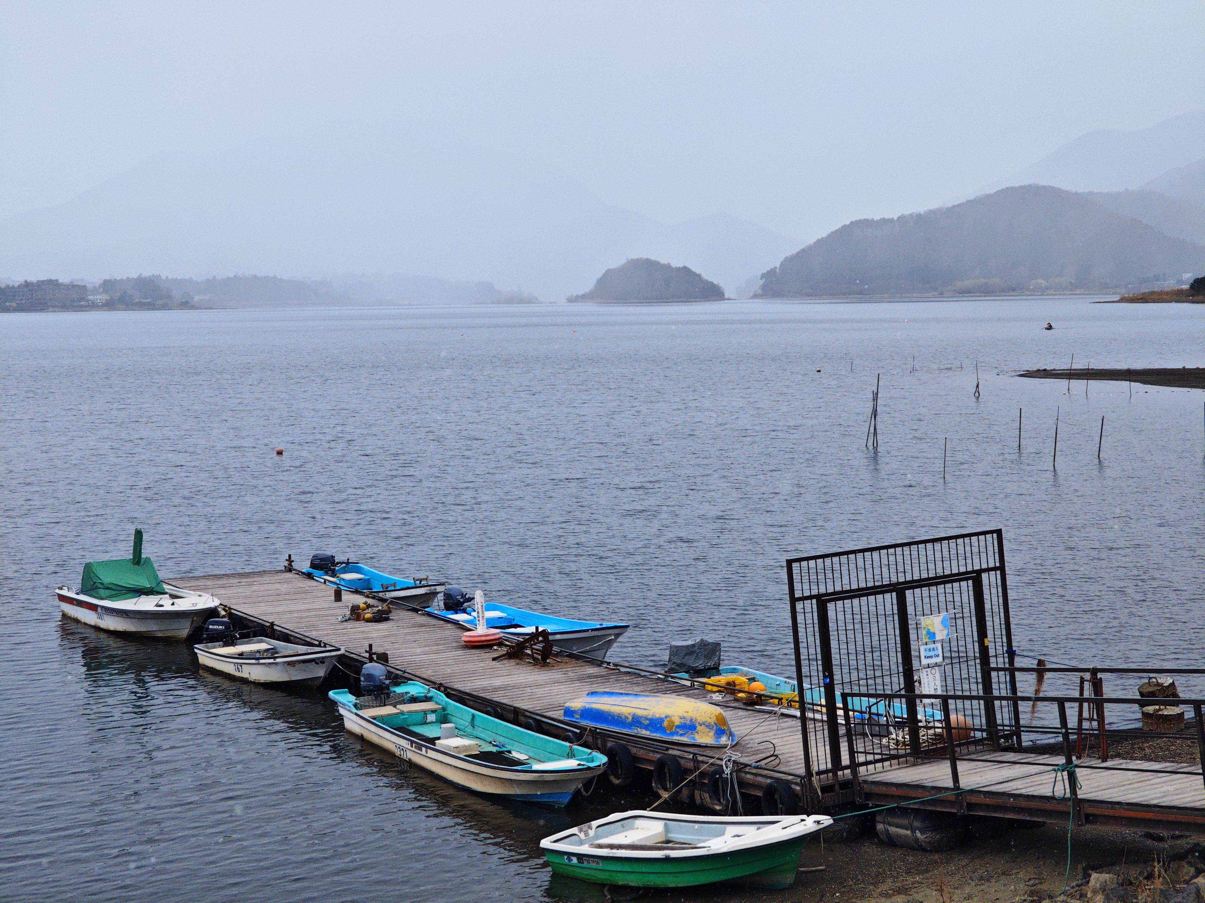 河口湖,画面左边偏上为云层掩盖的富士山位置。