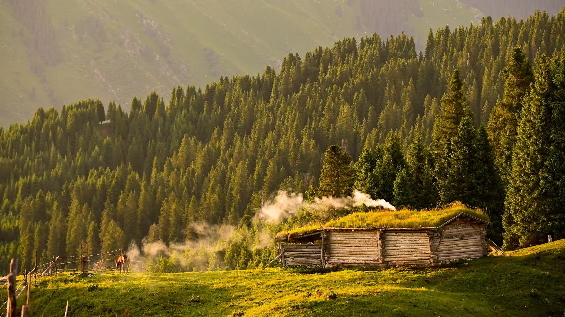 夏季,天山上遍地金黄的野花,奔跑的牛羊,纯净的湖水,倒映的雪山,构成一副优美的画卷。