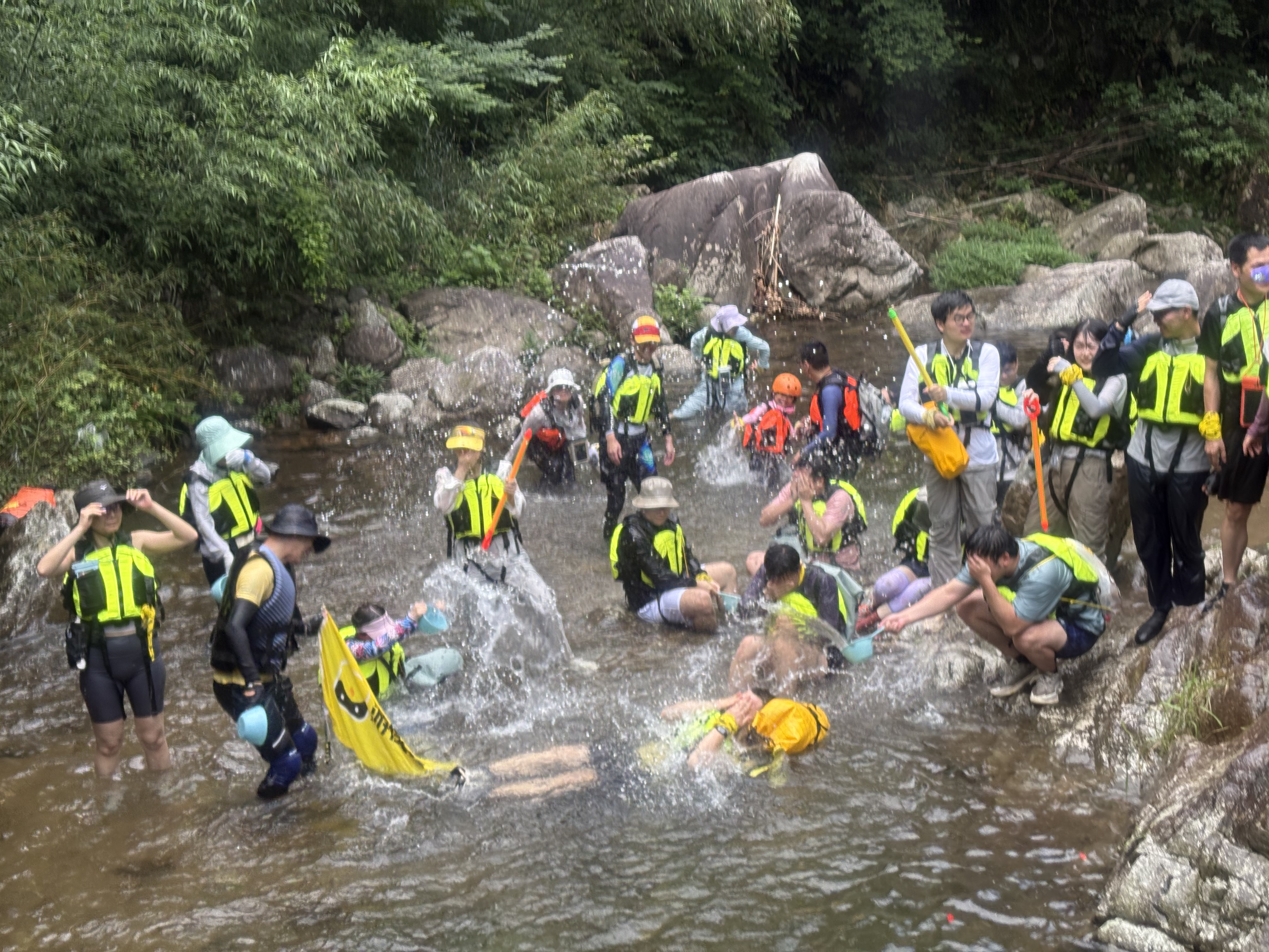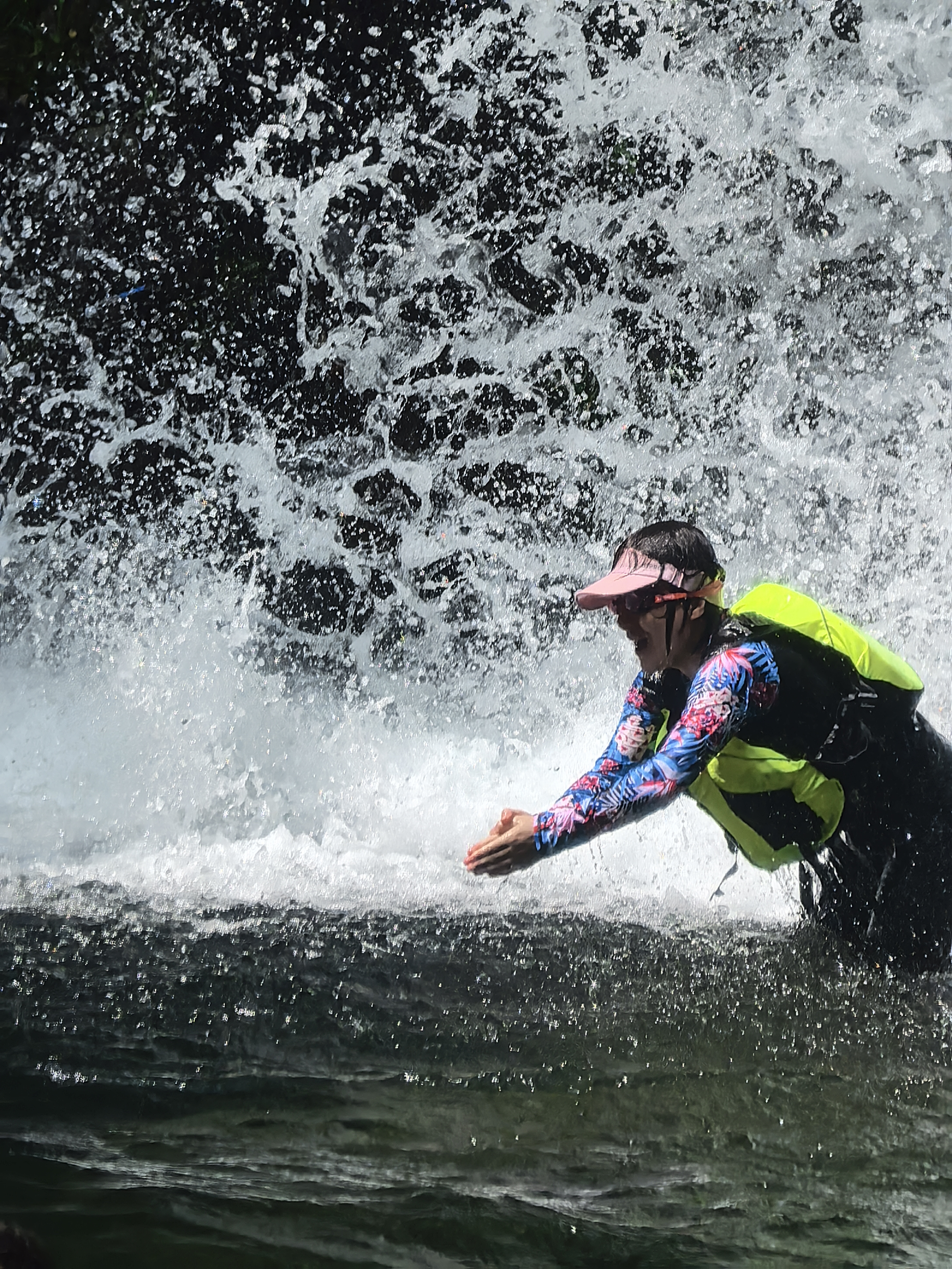 我大概是今天的“摔跤冠军”,一下水旁边的小伙伴冲着寿星一盆水飘来,我东倒西歪摔进水里。从此开启了,一路走一路摔一路打水仗的模式。常常是一只脚刚踩稳,另一只脚一动,脚下的石头就突然打滑,“噗通”一声坐进水里,溅得满身水花。摸索着前行,慢慢地学会,下脚前前后磨一磨看看我踩的石头滑不滑,然后再小心翼翼地踩过去。有的时候借助小伙伴的肢体支撑慢慢过去,31位游侠客小伙伴,转眼就成了互相兜底的家人,有人一路走,一路记录大家愉快玩水的样子。走到湍急的水口,我们开始排队,坐着水滑梯,一个个下来,乐此不疲闹开了。