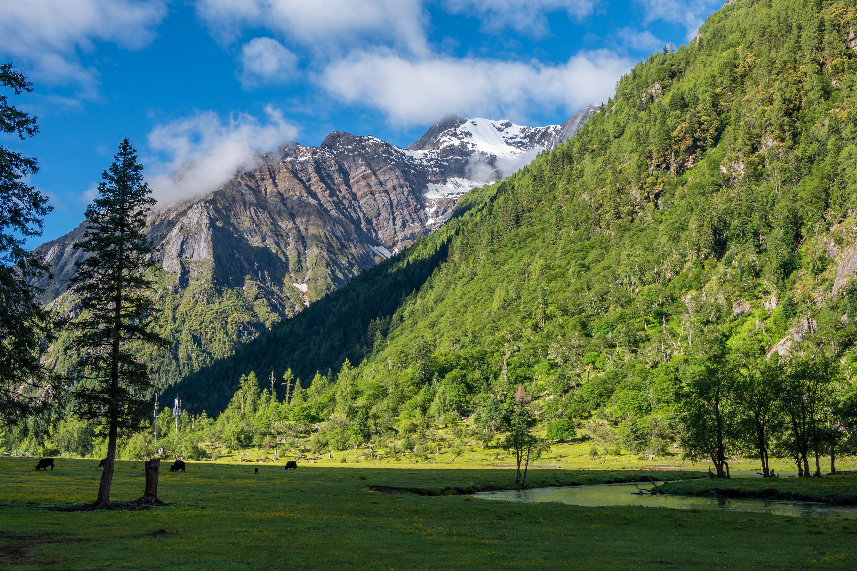 成都到四姑娘镇的车程被阳光晒得松软。大巴车翻过巴朗山垭口时,远处的幺妹峰突然从云层里探出头来,雪线以上银光凛冽,雪线以下被盛夏染成苍翠的斜坡上,成片的紫色马先蒿像是谁打翻了调色盘。猫鼻梁观景台的下午五点钟,金阳正给幺妹峰勾着金边,举着手机转圈录像——左边是雪峰,右边开着大片明黄色的驴蹄草,山下飘来的风里带着松针和牛粪混合的奇妙清香。