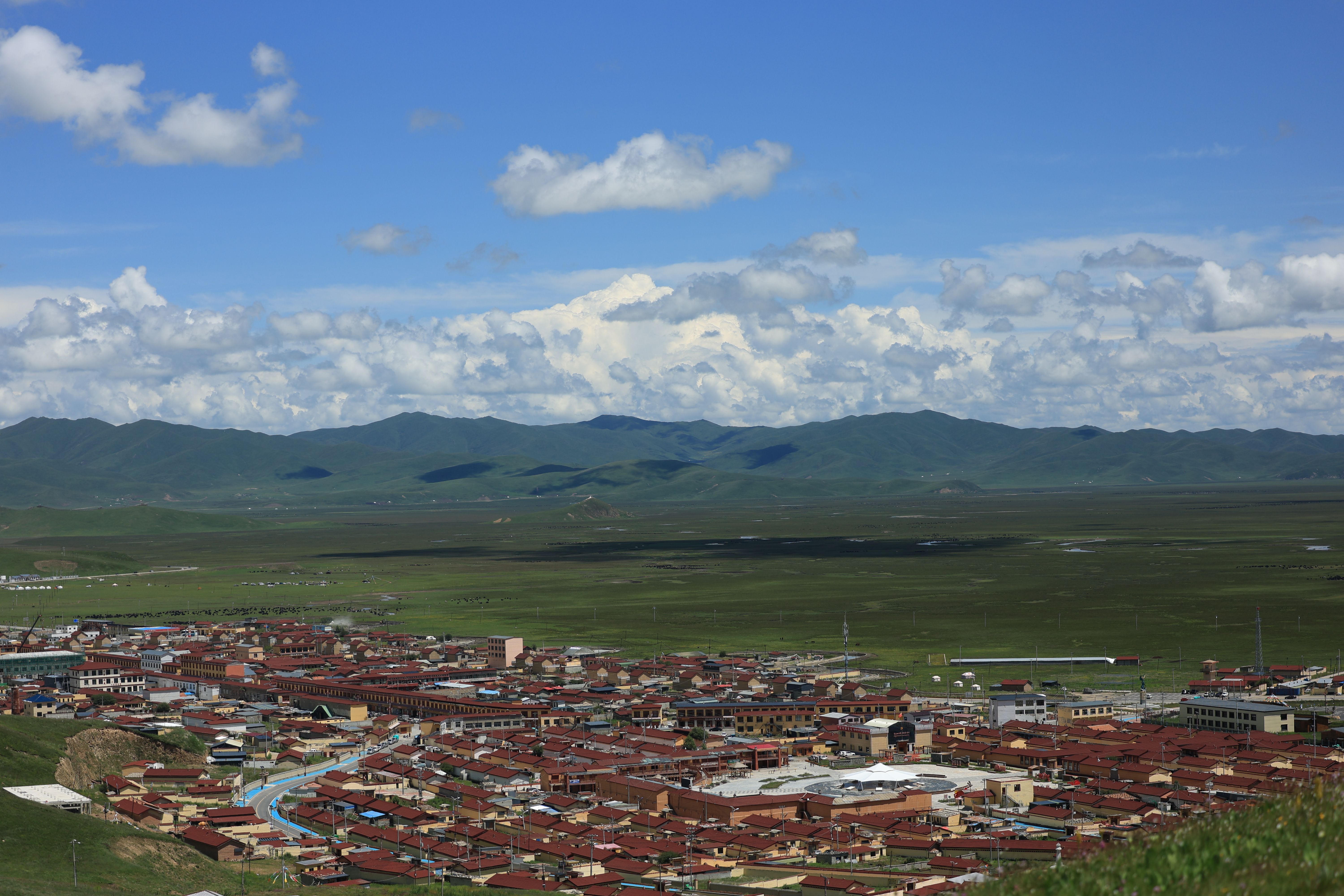 鸽群再次掠过,旋绕经筒金顶一圈,振翅飞入无垠青空。天地间,只剩下经筒内部十万真言转动的低沉摩擦声,与草原风呼啸的永恒和鸣,它们交织着、沉淀着,最终溶入黄河浊流那古老而深远的吟唱里,共同刻印在这片金蓝交织、圣俗交织的川甘大地上。高原强烈的日光蒸腾着草甸湿气,在每个人的轮廓边缘晕开一圈细小的光晕,恍若在转动的瞬间,凡俗的躯体也短暂地接住了一缕佛陀遗落人间的赤铜佛光。