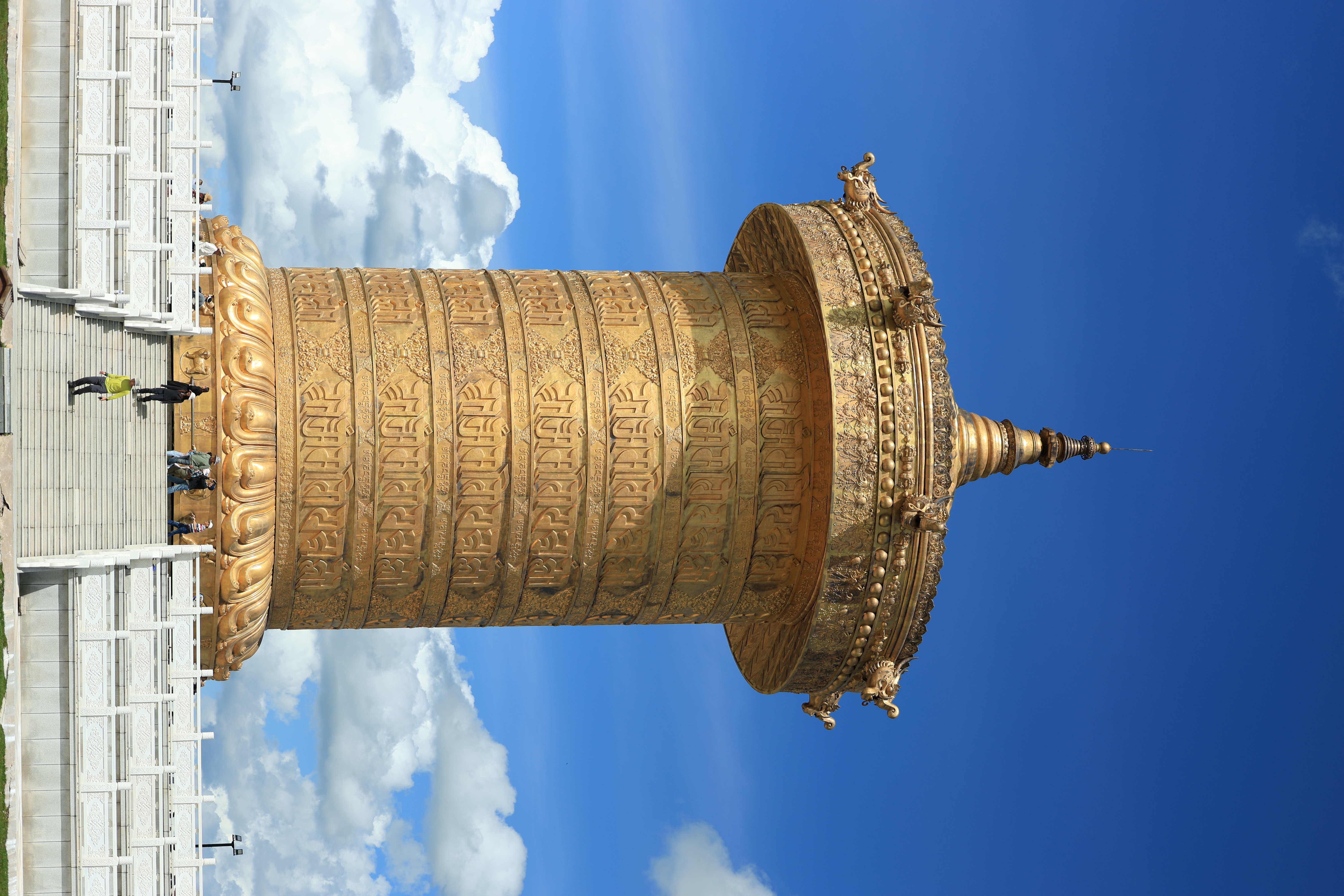 视线所及最高处,娘玛寺的金顶之下,巨大的转经筒如一座倒立的须弥金山,矗立在湛蓝天幕前。筒身由厚重的绛红、明黄、翠蓝、纯白木构交错镶就,如同集齐了高原上最饱满的色彩。筒壁覆盖着无数经咒雕刻,阳光将那些密匝的六字真言染成耀眼的金纹。众人屏息凝神,合力推动沉重的巨轴。经筒缓缓启动时,发出巨大而古老的摩擦声,似山岩与大地沉沉的私语。当沉重的筒体在合力之下开始均匀转动,浑厚声响如同大地心脏搏动之鼓点。筒壁四周镶嵌的“唵嘛呢叭咪吽”六字真言在运动中闪烁流淌,耀眼的金纹随筒身旋转汇成光芒之河。