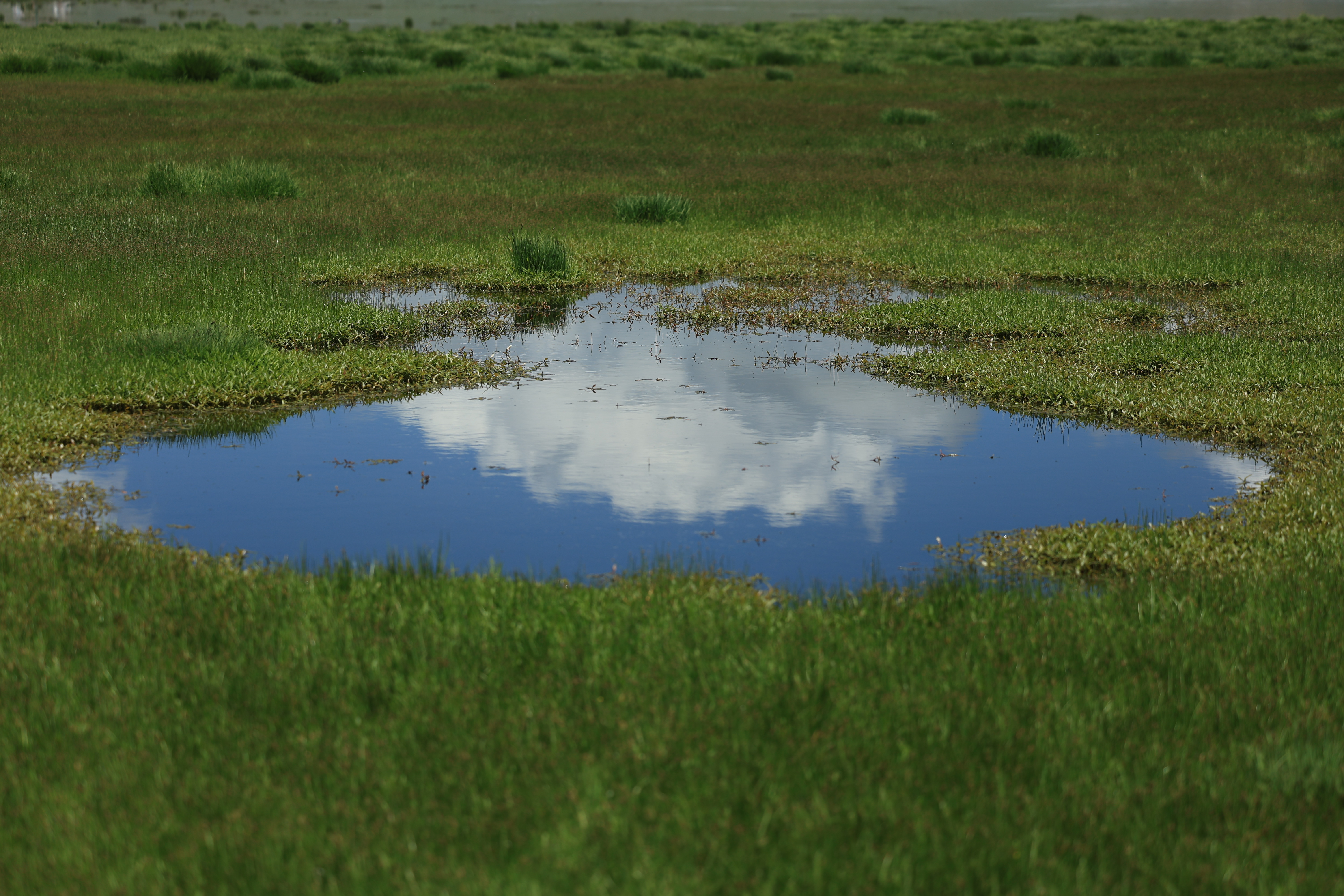 几只黑骨顶幼鸟倒惹人怜惜。它们形体已近父母,尚存几分稚拙憨态,藏身苇丛啃食水草叶尖时,忽被斜雨抽打脊背,便猛抖双翼。那覆羽将雨水珠玉般甩开,洒在青翠草甸,倒显得周围的水草愈发精神,绿丝绒铺展至天际,细密黄花点缀其中,如被寒气淬出的碎金,颗颗精亮。雨点坠入湖水,激起涟漪交叠,如千万张透明的嘴在无声咀嚼天地倒影。