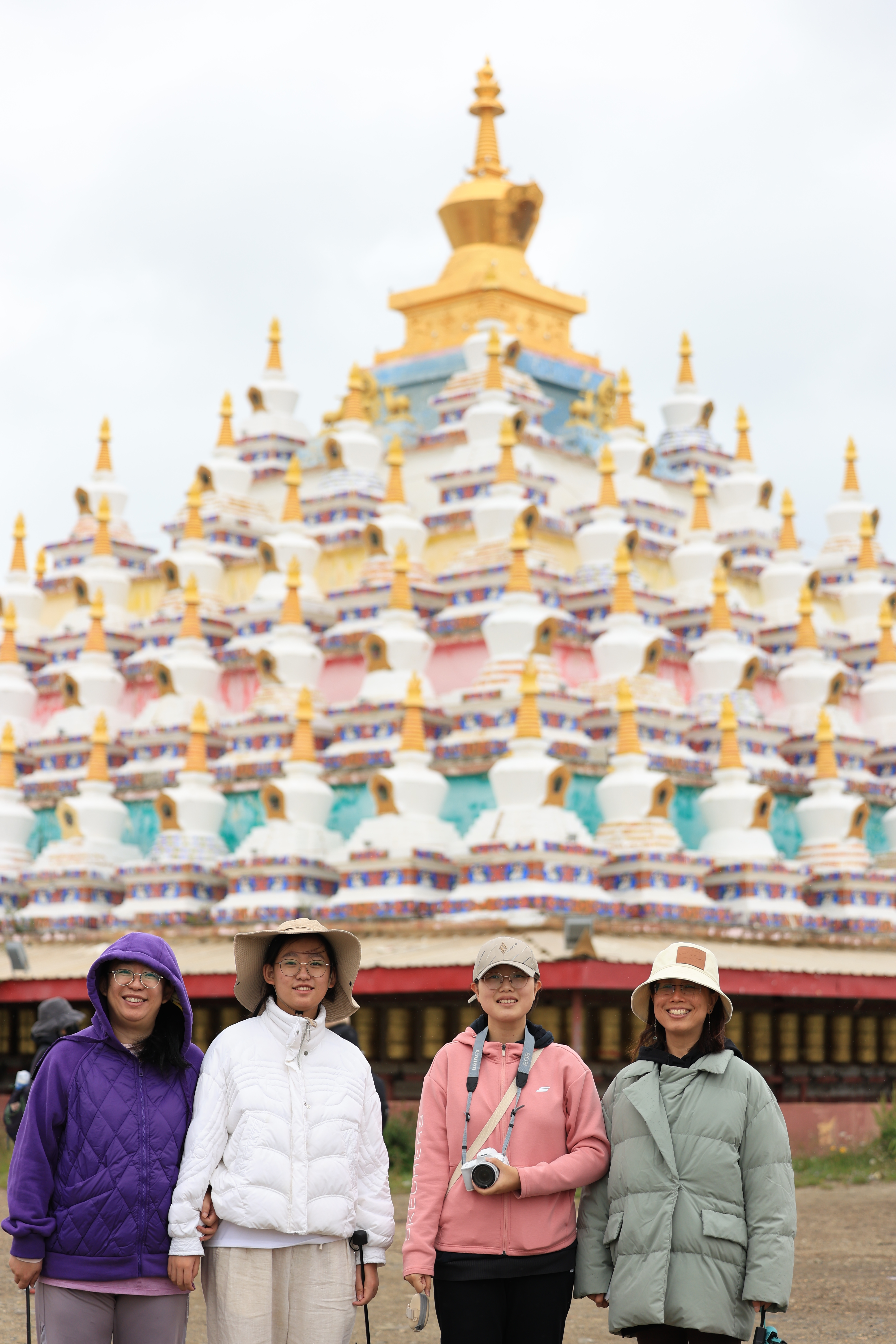 颠簸而行,郎木寺镇镶嵌于黛山环抱之中,塞赤寺的金顶在午后阳光下赫然跳出。肖导的声音在明澈的空气里低低响起:“那座牦牛毛的经幡下,便是大经堂。”金瓦在纯粹的蓝幕下流淌着熔金般的光泽,仿佛从太阳中心切下的一大片炽热本体,安放在人间。转动的经筒阵列如沉默的士兵,铜质的反光在阳光下流动,金属摩擦的低吟混着风声,是这片寂静高地最浑厚的背景音。仰望弥勒殿飞檐上精雕细琢的法轮金鹿,日影在其上缓慢推移,金粉闪耀得近乎灼目。巨大的藏式窗棂如一双双深邃的眼,注视着朝圣者的灵魂如何被佛光反复清洗。