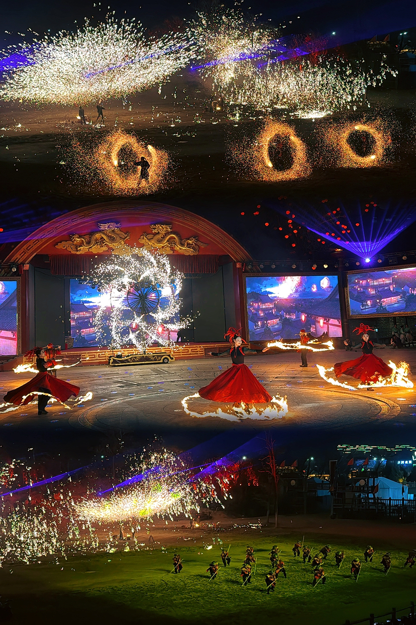这里说一下一定要看的几个表演:岳飞枪挑小梁王、东京保卫战、球幕影院《飞跃清明上河图》、AI雅颂、岳飞郾城大战、火神冲浪、打铁花。