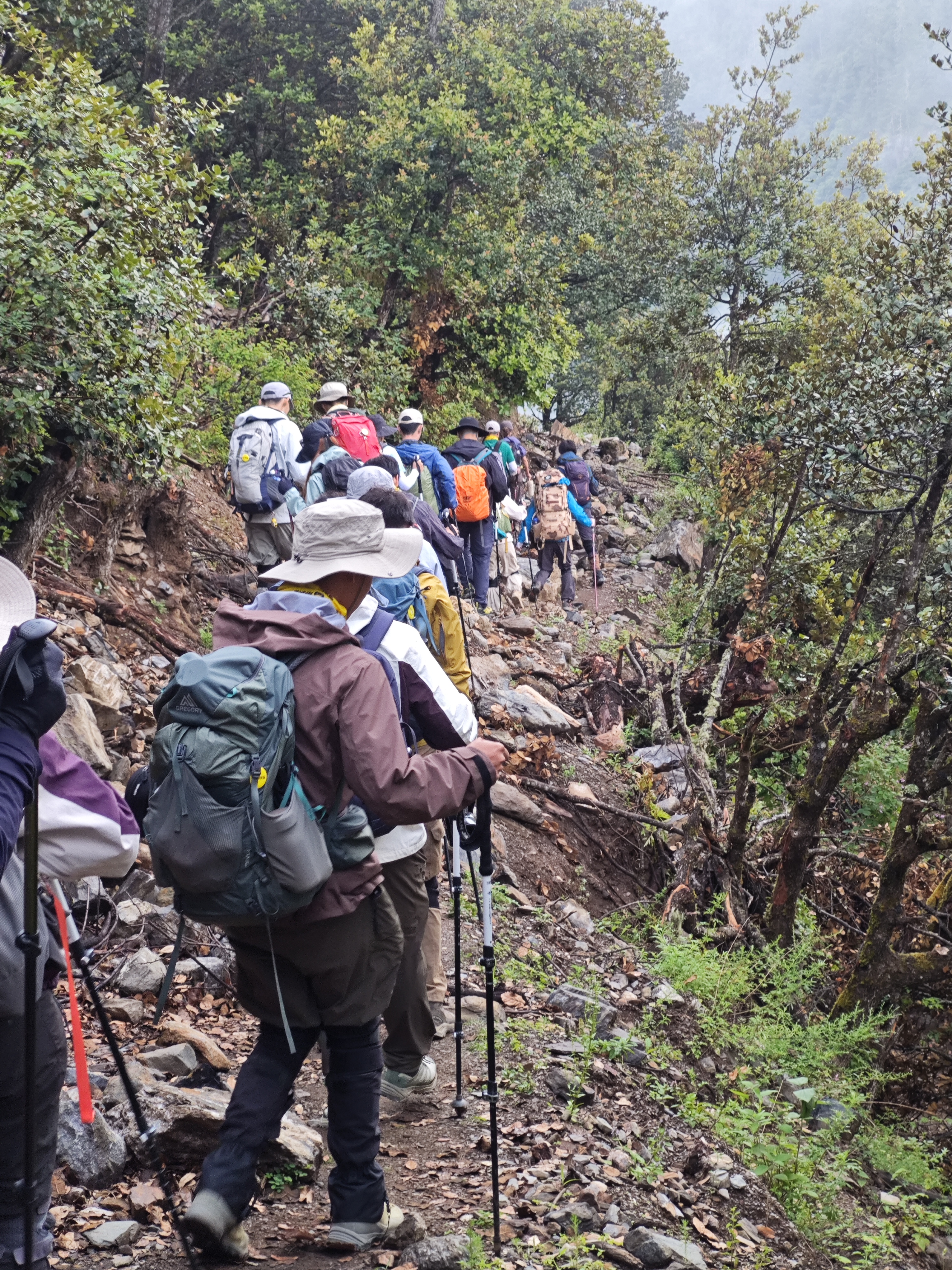 在飞来寺欣赏完绝美的日出后,我们便向雨崩村进发。从西当温泉开始徒步,穿越原始森林,一路上,高大的树木遮天蔽日,阳光透过树叶的缝隙洒下,形成一道道金色的光柱。空气中弥漫着泥土和树木的清香,让人神清气爽。