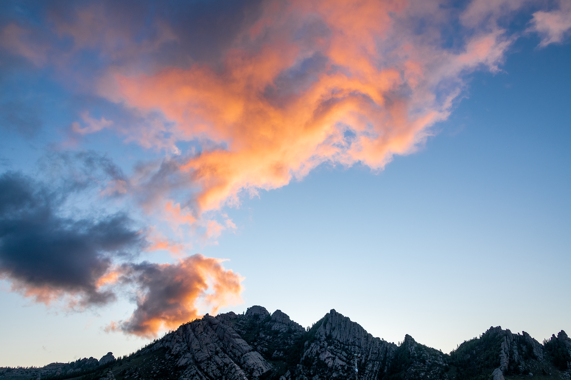 晚入住蒙古包度假村,当夕阳照射在一排排白色蒙古包上,仰望蓝天白云间翱翔的雄鹰,日照金山的美景在山峰上呈现,安静的特日勒吉,梦幻的景色怎不让我在这大自然中静静入眠呢?可事与愿违,刚要入睡狂风大作,雷雨交加,瓢泼大雨打在蒙古包上啪啪作响,雨就这样一直下着……。不知什么时间被寒冷冻醒,望向蒙古包外朝霞已经染红半边天,本想草地上无法行走,可踩在地上就像没下过雨一样,原来是这里的地质决定的,整个戈壁草原都属于沙石地质,所以草都生长的矮矮的,表面一点水都无法存储。这也是蒙古草原的一大特色。