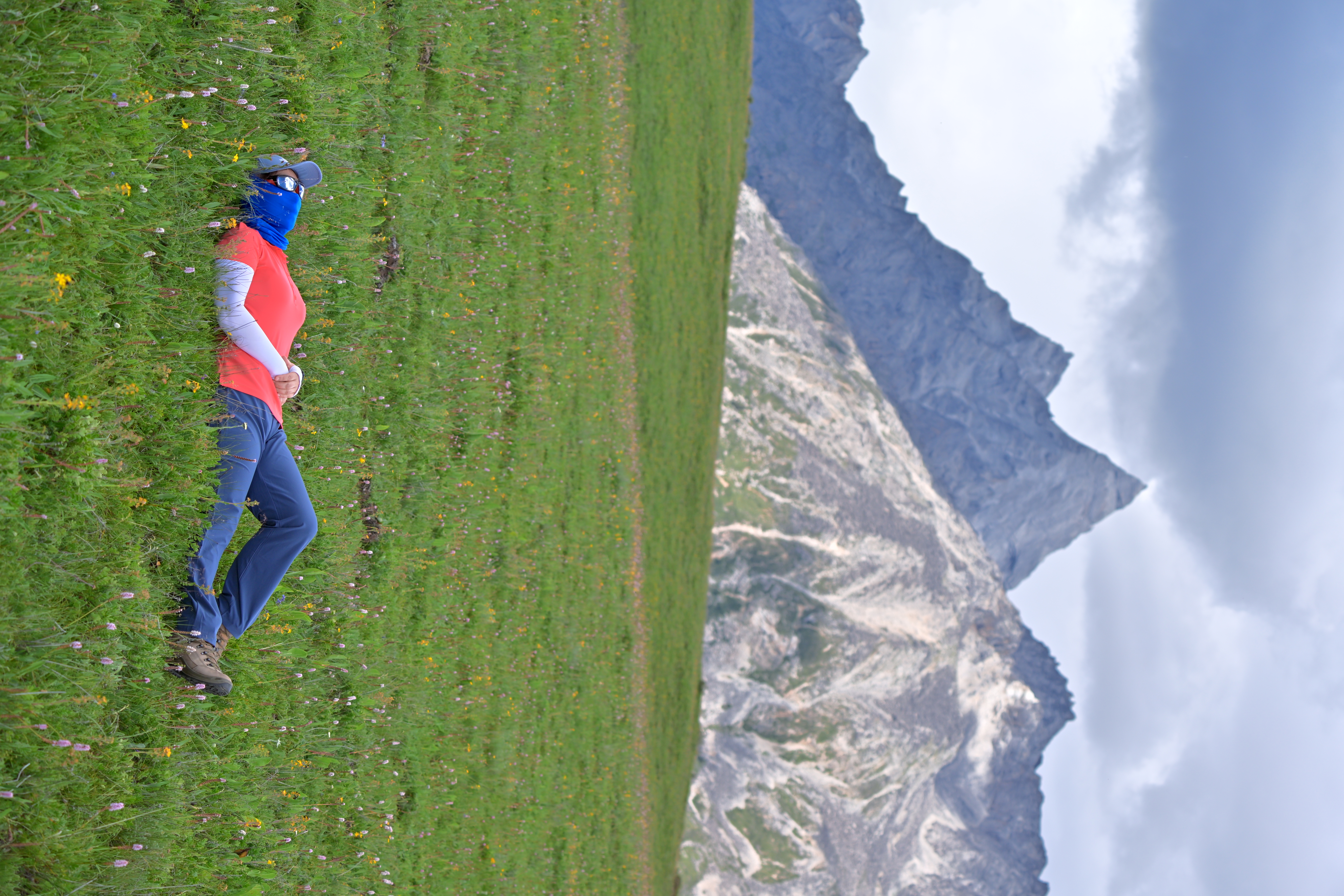 山顶位置是一块宽阔的草甸,到达山顶意味着今天的爬升结束。徒步的第一天显然大家还没有完全适应这个海拔,不高的爬升但是都走的精疲力尽。不过稍作休息后拍摆烂照也是必不可少的。