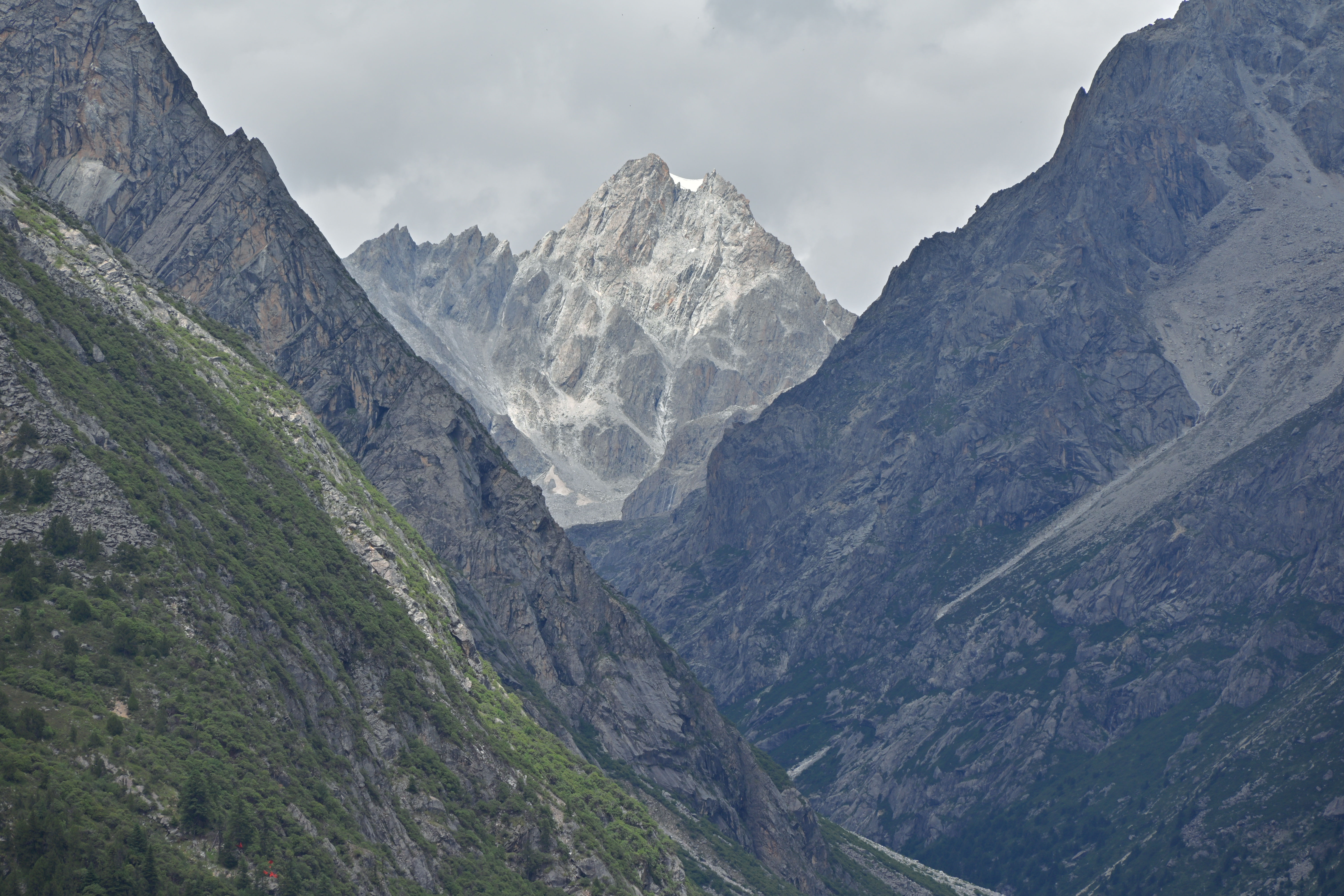 到达老冷古寺后还有路可以继续往里面走,后面游客相对较少,而且也没有摩托车,所以走起来体验会更好。抬头左边便是格聂雪山东坡。东坡是陡崖很难积雪,所以夏季几乎都是裸露在外面的岩壁。只有山顶附近的位置可以看到冰川飞挂,相当壮观。