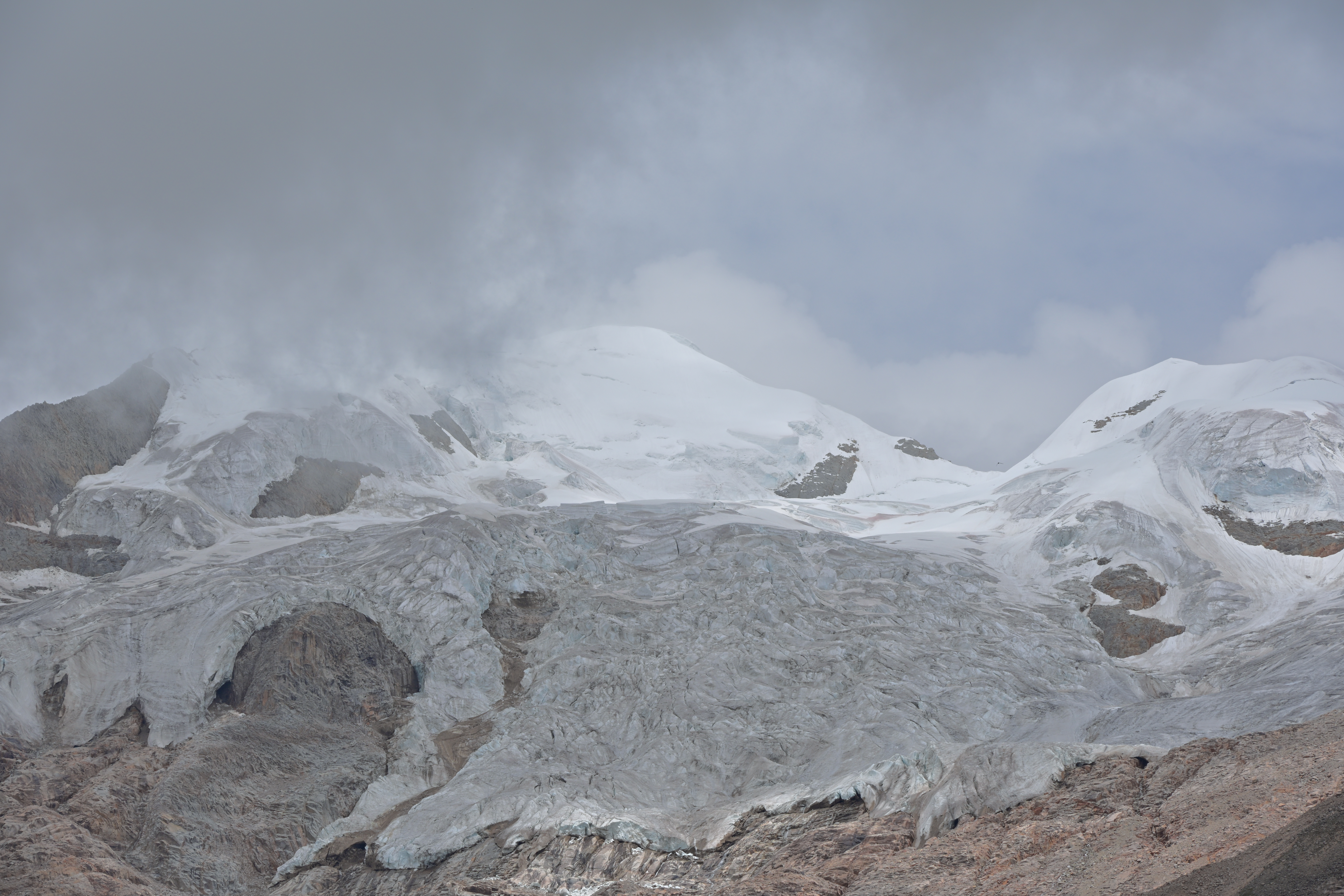 南坡这一面坡度相对缓一些,山上有大面积的冰川,往上大多数关于格聂的照片也是在这一面拍摄的。