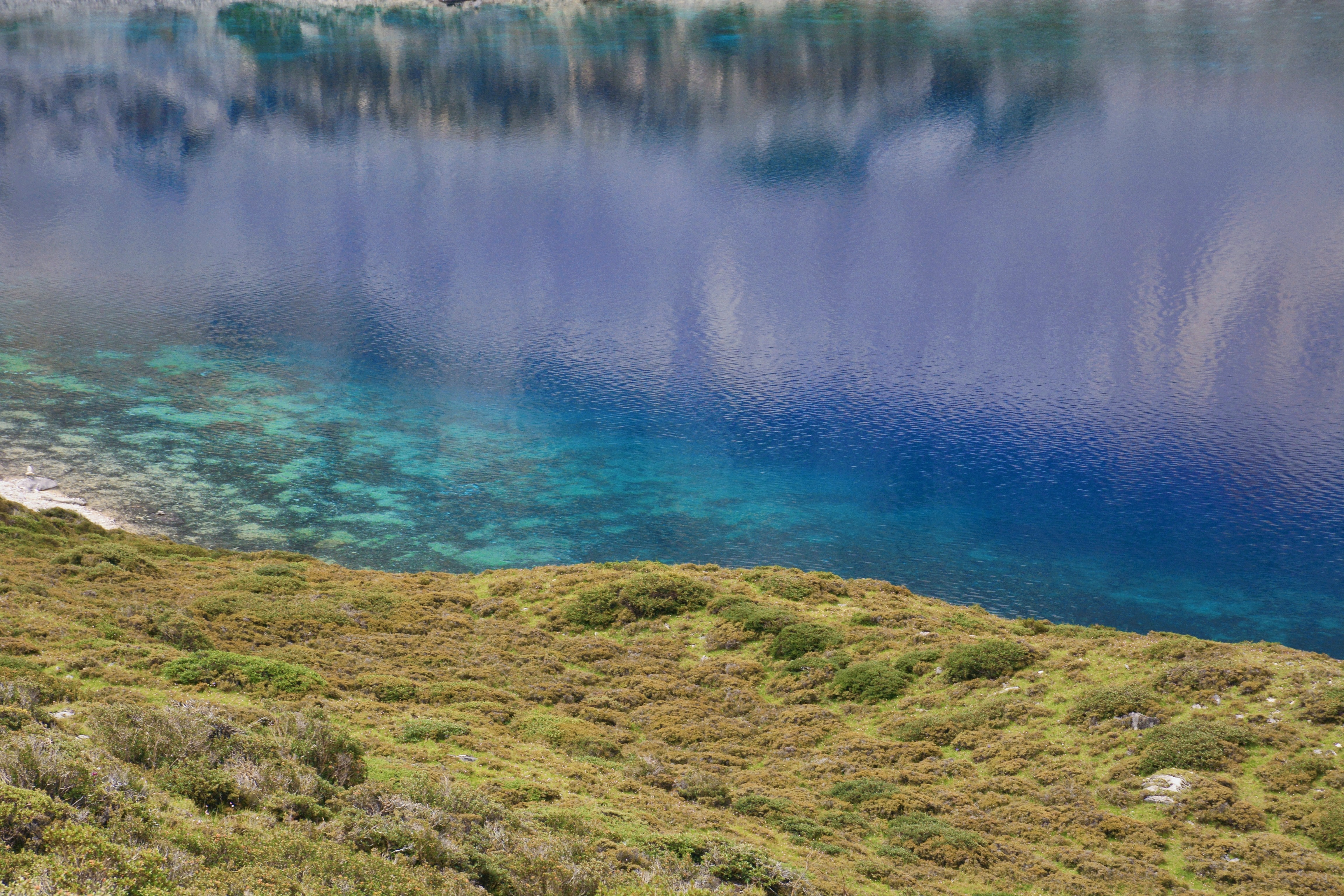 当天天气晴好,于是我忍不住围绕牛奶海顺时针转湖一圈。此刻,在阳光的照耀下,湖水清莹碧绿,美轮美奂。不愧是亚丁三大圣湖之一!