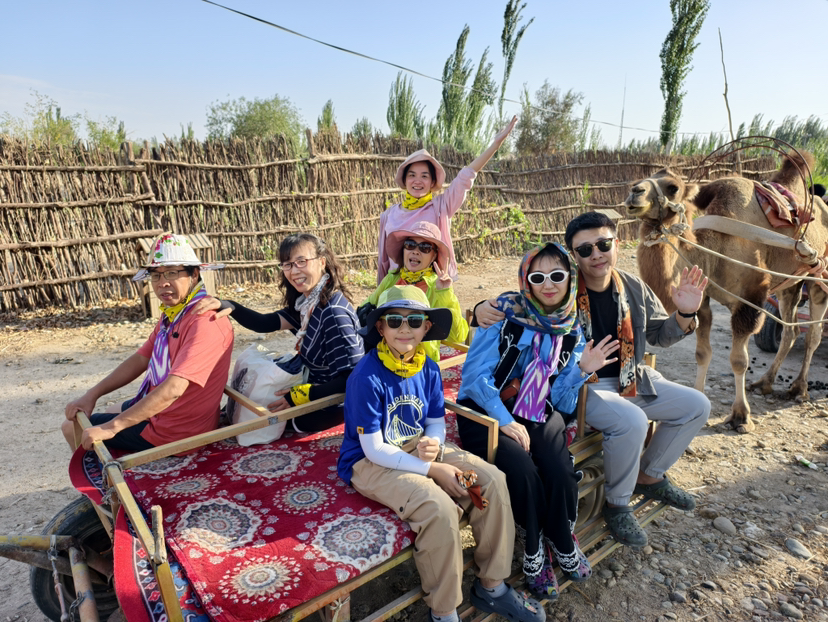 傍晚时分,我们乘坐骆驼车进入沙漠古村,享受了一场特别的下午茶。坐在传统地毯上,品尝着维吾尔族特色茶点和水果,看着太阳缓缓沉入沙丘,这一刻仿佛时间都停止了。