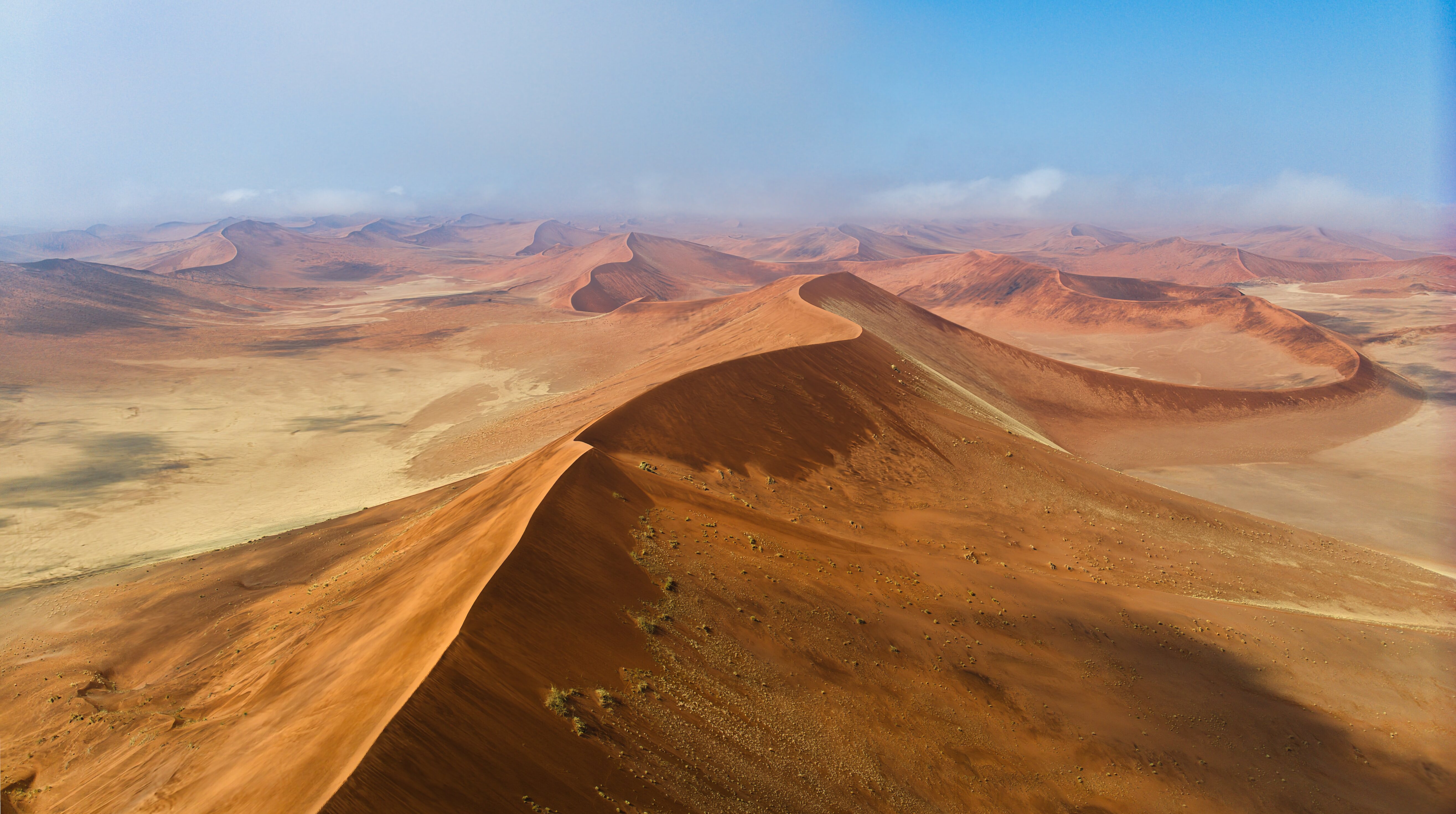 纳米比亚红沙漠,也就是苏丝斯黎沙漠(Sossusvlei),位于纳米比亚南部,是纳米布沙漠的一部分。它可是世界上最古老的沙漠,干旱和半干旱的气候已持续了最少8千万年。这片沙漠形成于8000多万年前,纳米比亚与南非边境的奥兰治河的河沙,在本格拉寒流、洋流和风的共同作用下,移向北方,在纳米比亚海岸线堆积成巨大沙漠。而且河沙中丰富的铁元素,历经亿万年氧化,让沙粒呈现出红色,形成了独特的红色沙丘景观。在漫长岁月里,当地特殊的气候条件下,早晨沙子从晨雾中吸收水分,铁被氧化后沉淀在沙粒表面,日积月累,便形成了独特的红色沙子