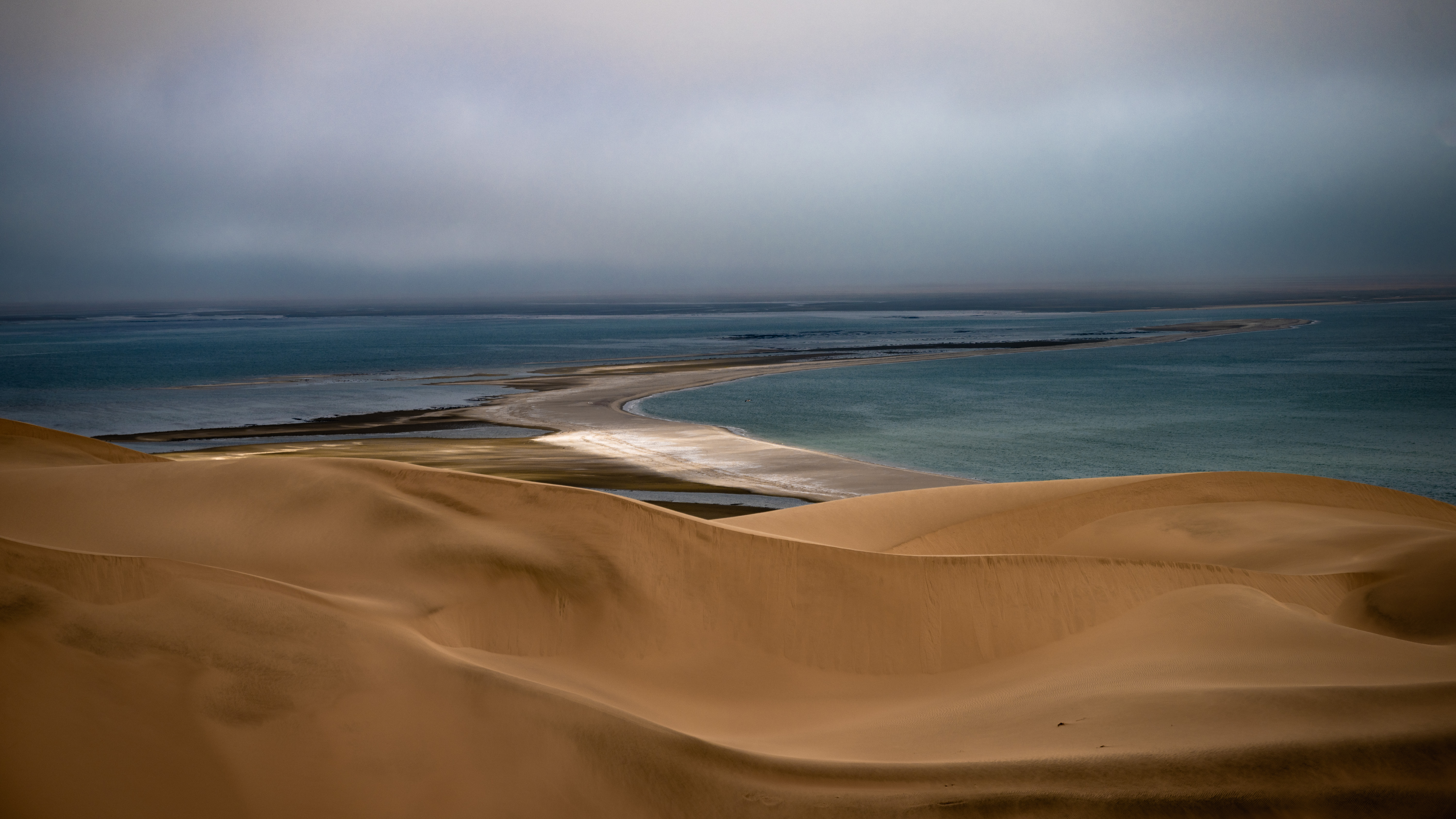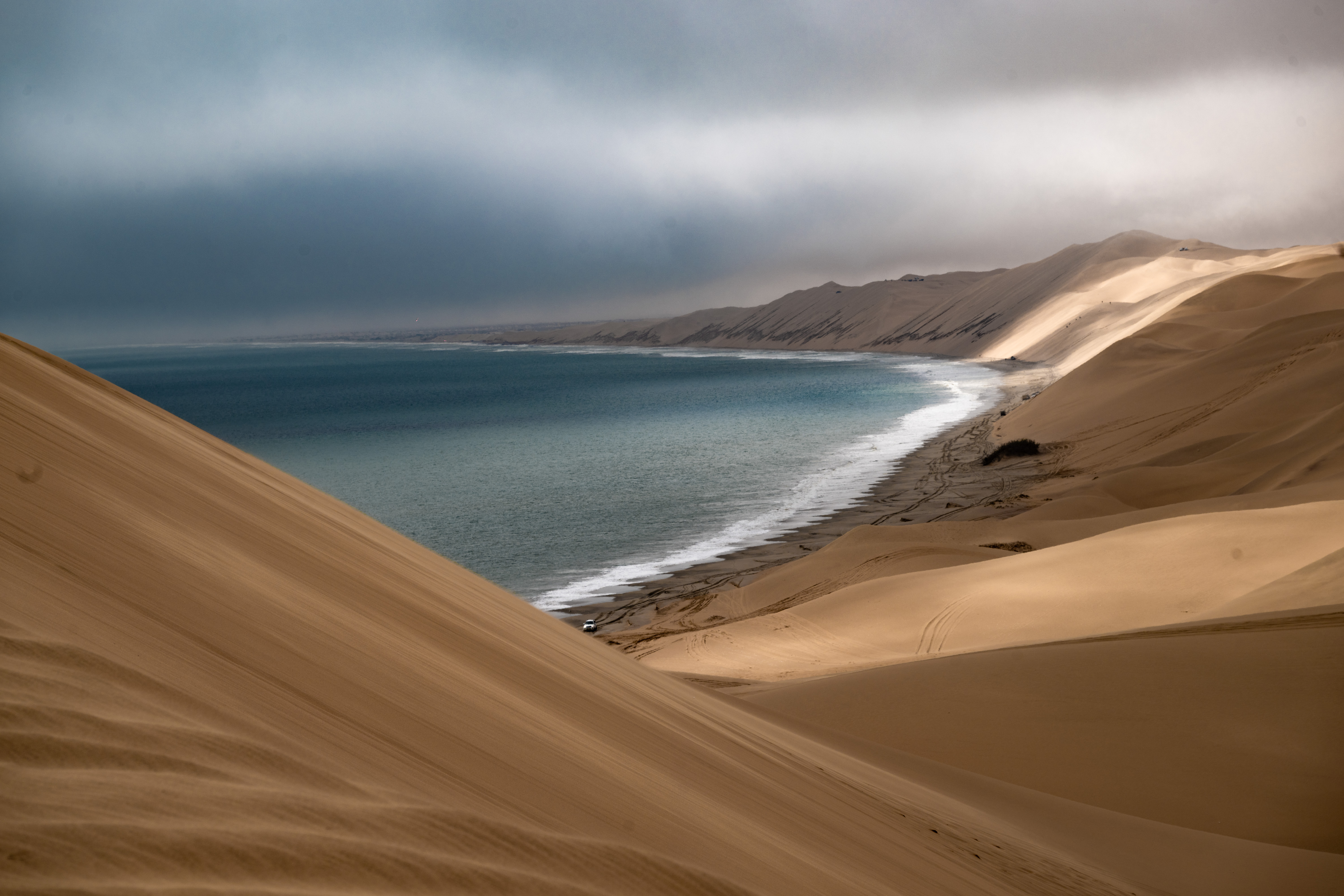 在三明治湾的海边,分布着众多彼此相连的陡峭沙山。纳米比亚本身是沙漠广布的国家,地处南回归线附近,常年受副热带高气压带控制,加上本格拉寒流流经,气候干旱,属于热带沙漠气候,西部沿海平原和内陆的沙漠为沙山形成提供了丰富沙源。而且该地区受东南信风影响,持续的东南风把内陆沙子搬运到西部沿海沉积,一部分在陆地堆积,一部分飘落在海洋。之后,海洋中的海浪又将海里的沙子推向海岸沉积,逐渐形成了这些巨大而陡峭的沙山