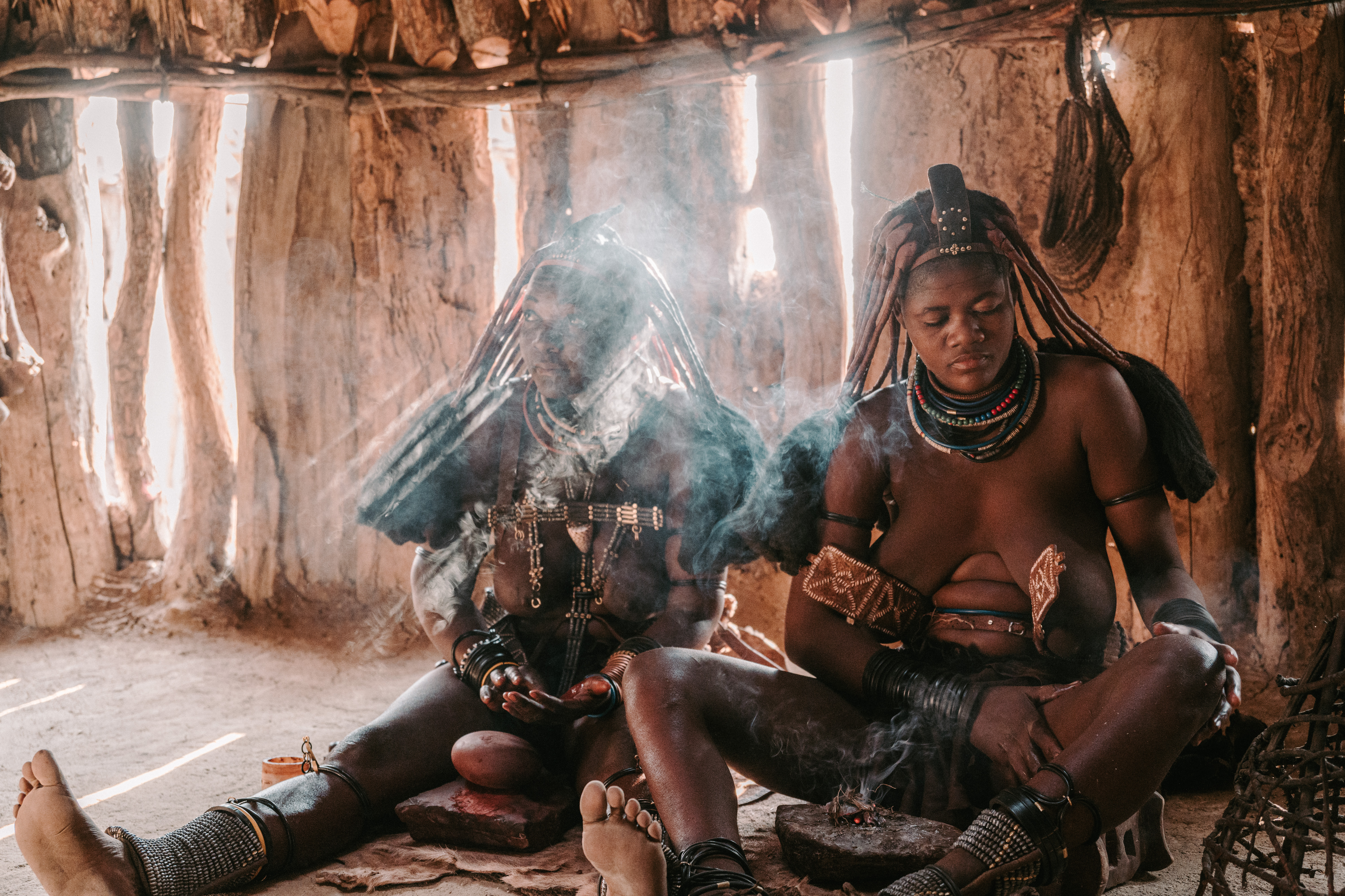 红泥人最显著的特点就是女子常年用红泥涂抹身体和头发。这种红泥是由红色石头磨成粉末,再与动物油脂混合而成。由于当地干旱缺水,水资源比黄金还珍贵,红泥涂抹既可以保湿美容,又能防晒保暖,还能防止蚊虫叮咬,成了他们在恶劣环境下的生存利器。而且为了应对身体异味问题,女性会用一种特殊香料植物点燃后的烟雾熏染身体